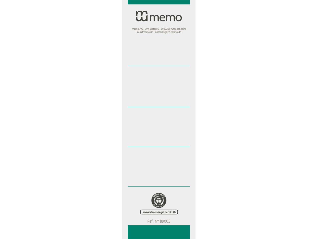 Ordneretiketten von memo sind aus 100 % Altpapier hergestellt. Der verwendete Kleber auf Acrylbasis ist lösemittelfrei. Die Etiketten sind mit dem Blauen Engel ausgezeichnet.