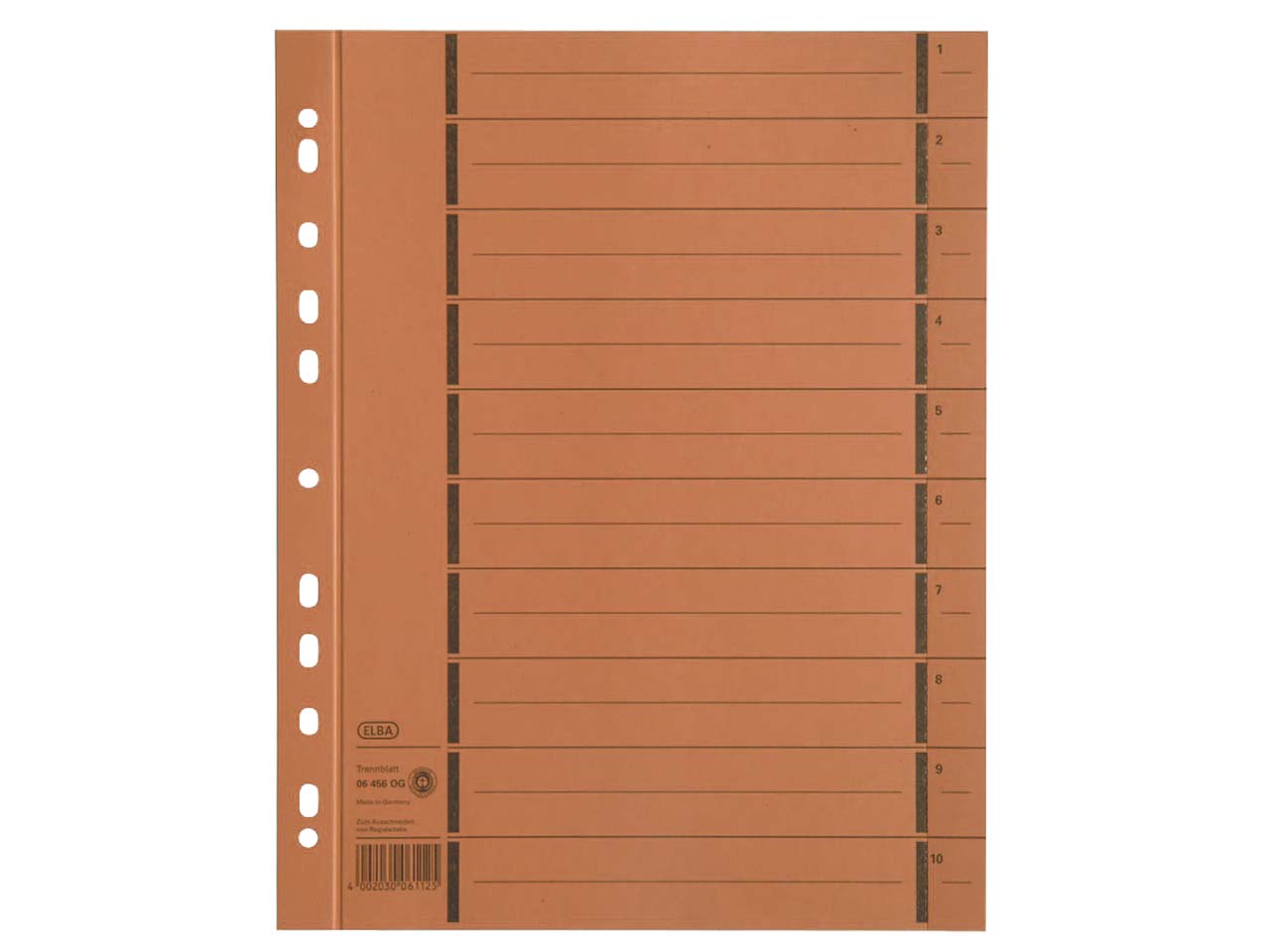 Schere war gestern - Trennblätter von ELBA haben perforierte Taben zum schnellen Abtrennen und Sortieren. Durch aufgedruckte Linien können die Trennblätter ausführlich beschriftet werden. Damit sind sie ideale Ordnungshelfer für Schnellhefter und Ordner in Schule und Büro. Stabiler 250 g/m²-Karton aus Recyclingmaterial verhindert das Ausreißen. Vorteilspack mit 100 Stk.