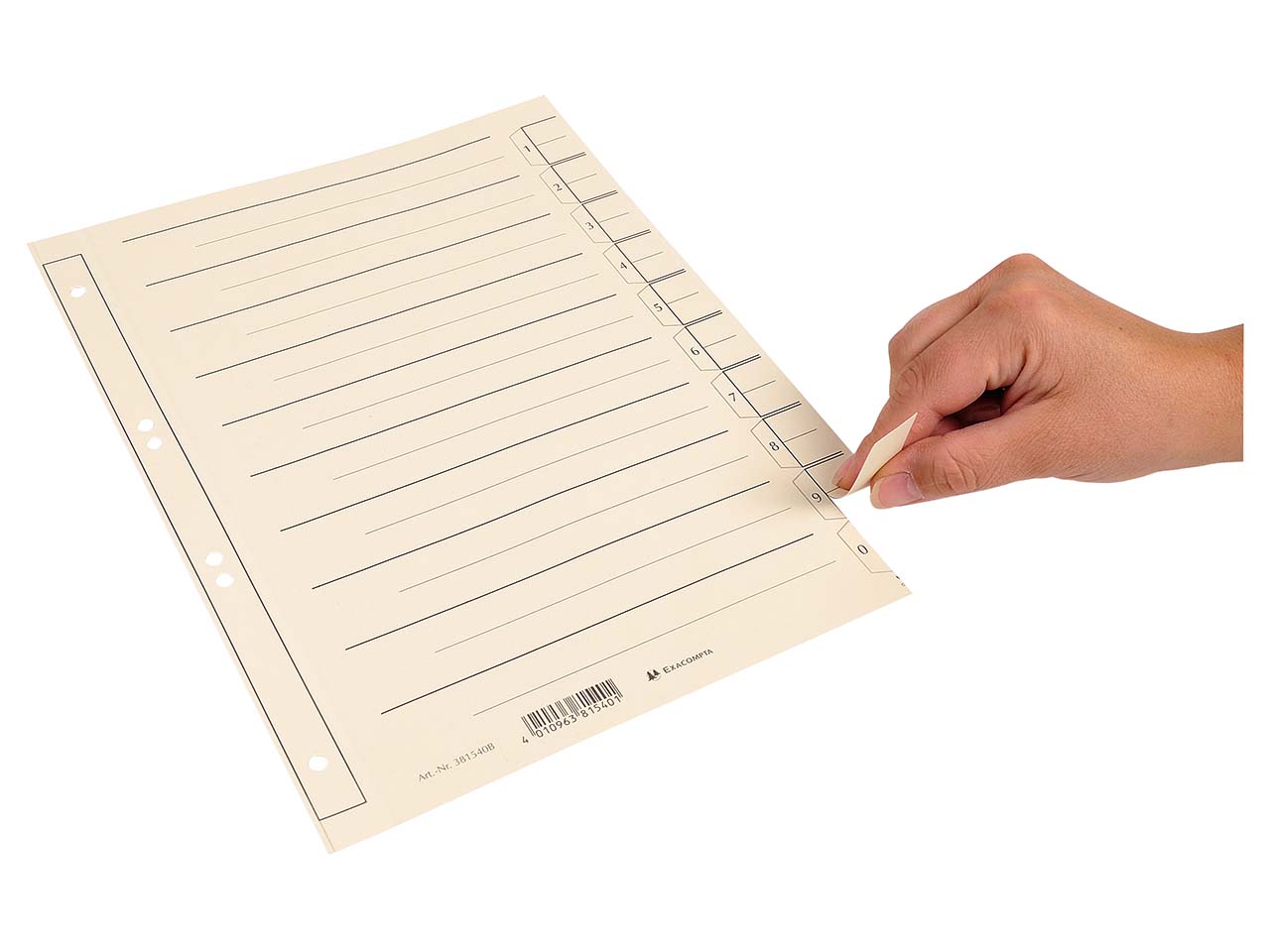 Die mit dem Blauen Engel ausgezeichneten Exacompta Trennblätter bestehen aus stabilem, recyceltem Kraftkarton mit 230 g/m². Sie haben eine 6-fach-Lochung und Organisationsdruck. Im Format 234 x 297 mm, für DIN A4. 1 Pack = 100 Stk.