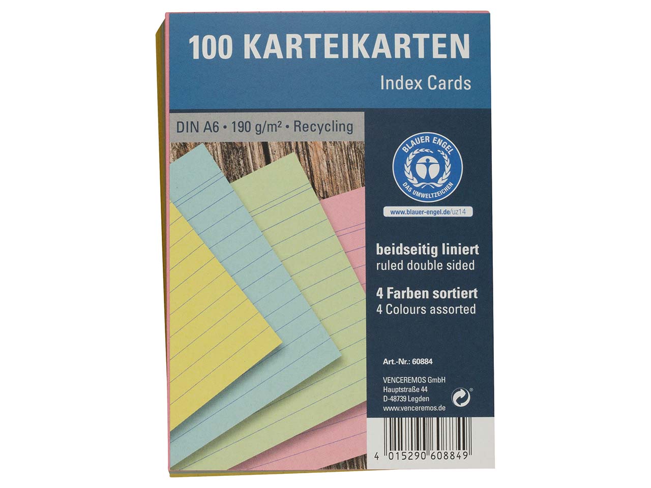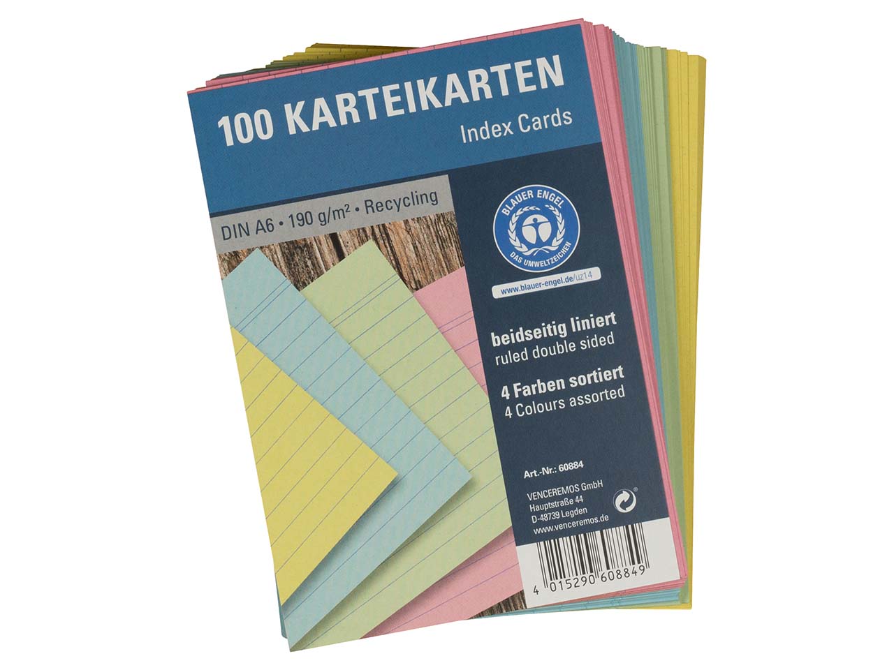 Die quer linierten Karteikarten eignen sich für eine Vielzahl von Zwecken in Schule und Büro. Die mit dem Blauen Engel ausgezeichneten Karteikarten im Format DIN A6 sind in farbig sortiert (rot, blau, grün, gelb) erhältlich. In starker 170 g/m²-Qualität. 1 Pack = 100 Stk.