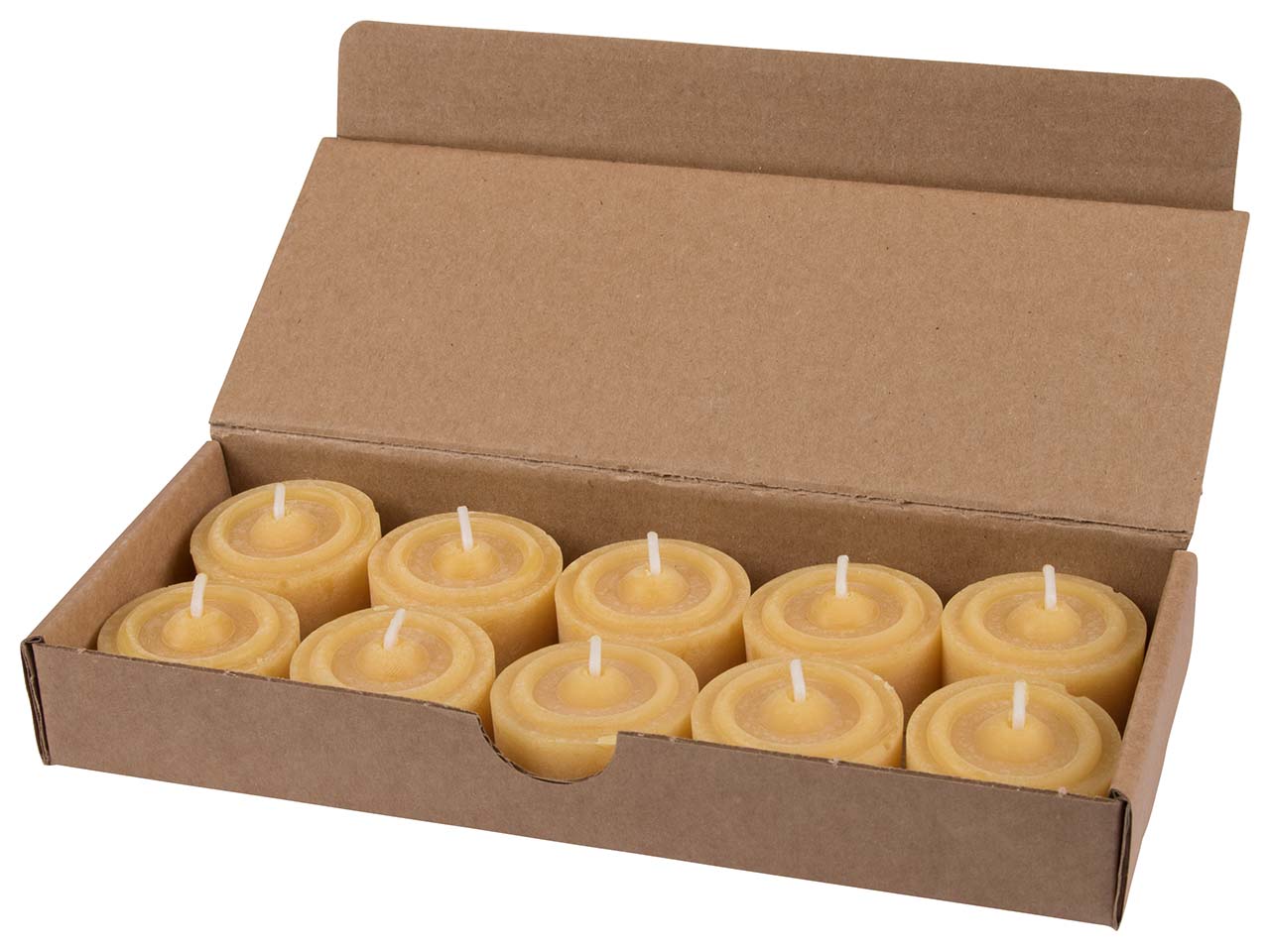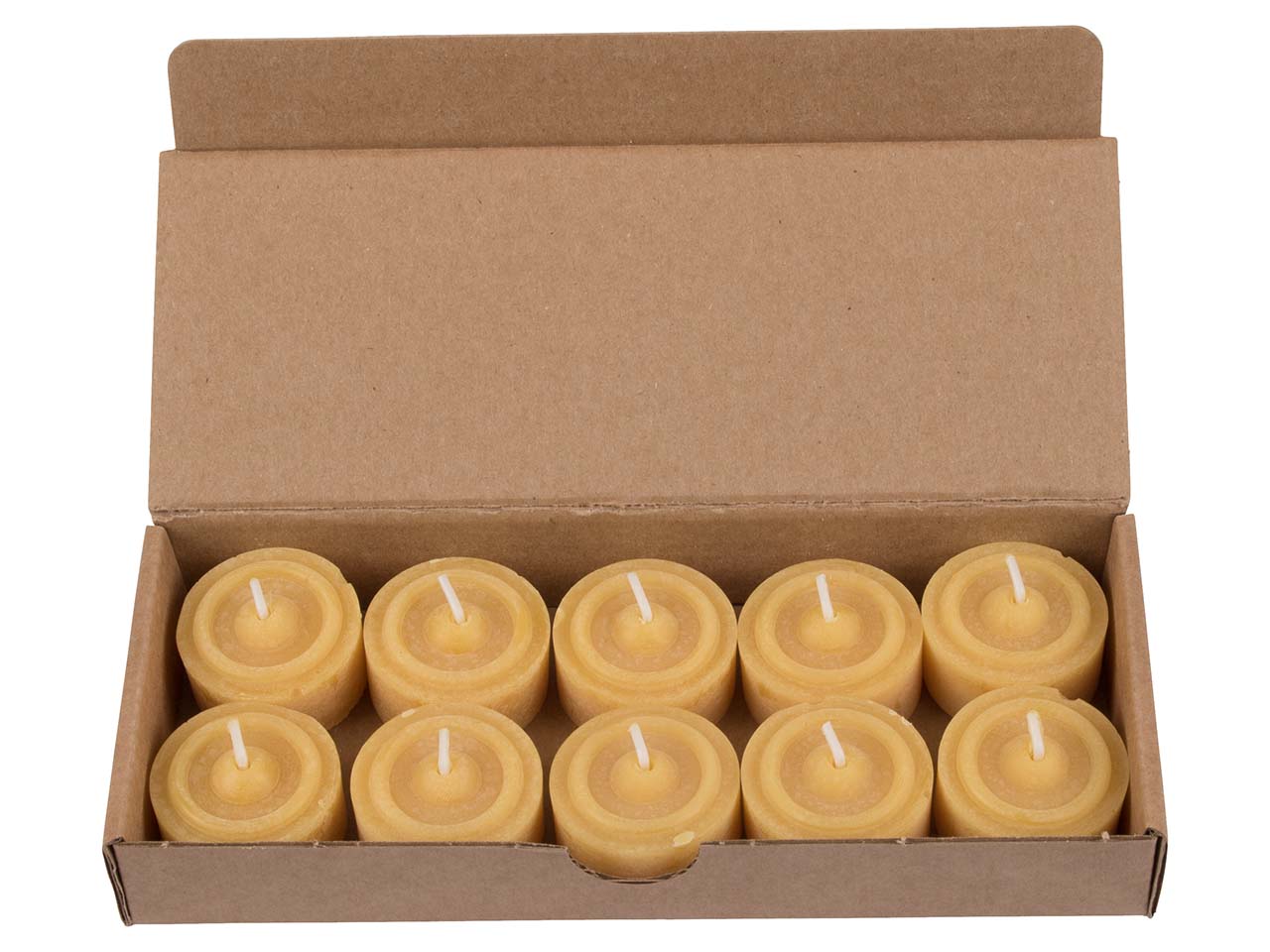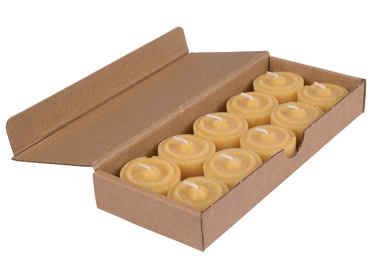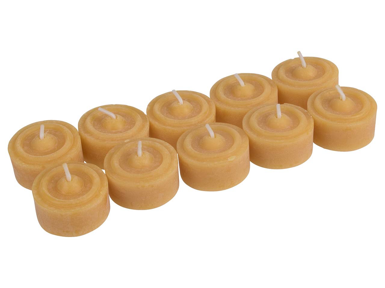 Hochwertige Teelichter aus reinem Bienenwachs. Die gegossene Qualität sorgt für gleichmäßigen Abbrand. Die Bienenwachs-Teelichter haben eine Brenndauer von ca. 5 Stunden. 1 Pack = 10 Stk.
