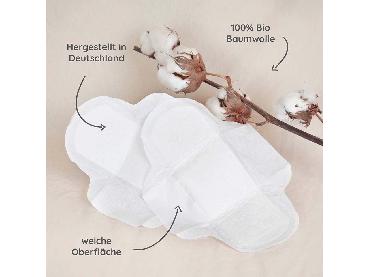 Körperkontaktmaterial: 100 % Baumwolle (Bio) Verteilungsvlies: Vliesstoff Saugkern: Zellulose Bio-Airlaid (TCF) (PEFC zertifiziert) Wäscheschutz: Hygienefolie |