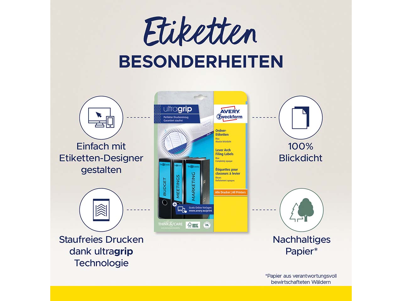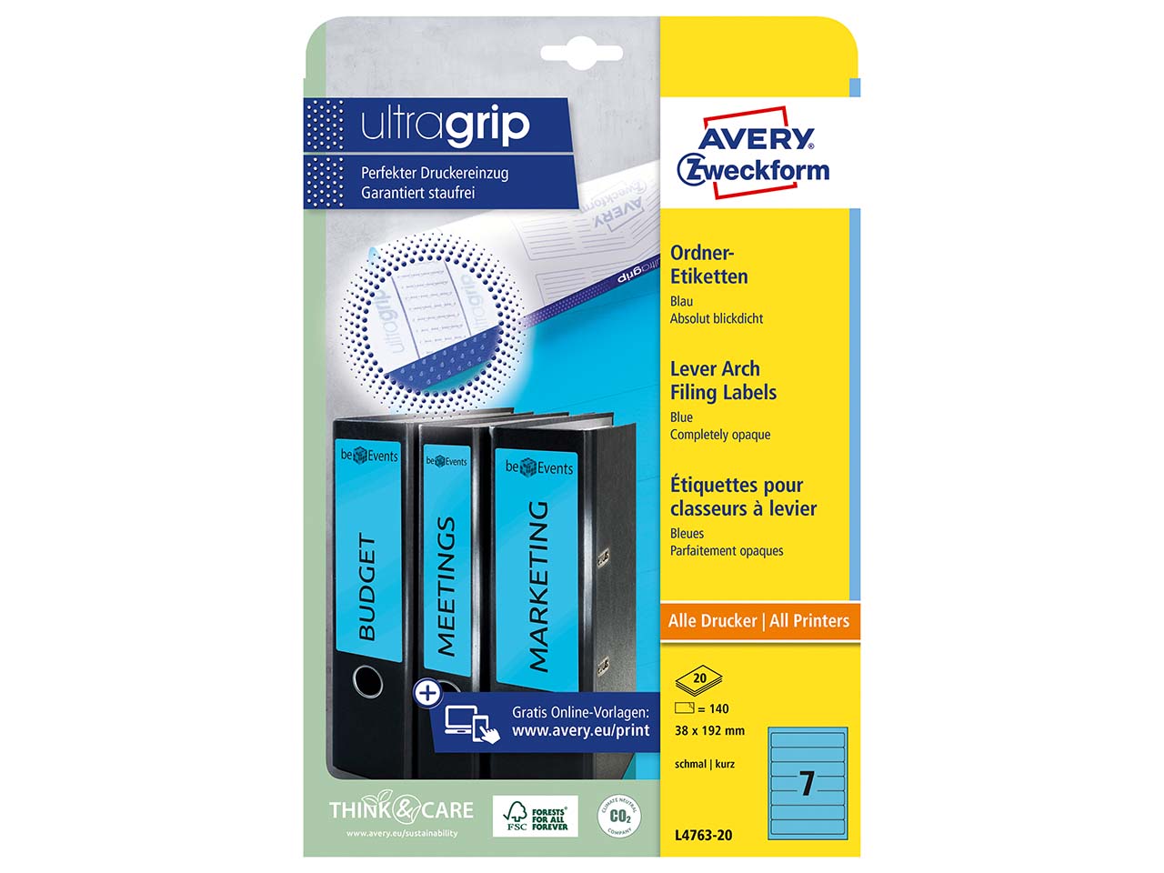Die selbstklebenden Ordneretiketten sind für den Einsatz auf Kopierer, Tintenstrahl- und Laserdrucker geeignet. Format DIN A4. B 3,8 x H 19,2 cm. 1 Pack = 20 Blatt. Farbe blau.