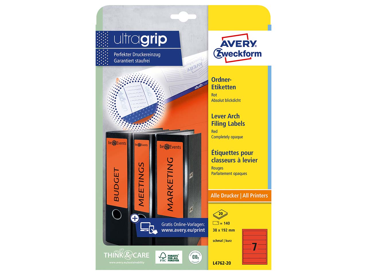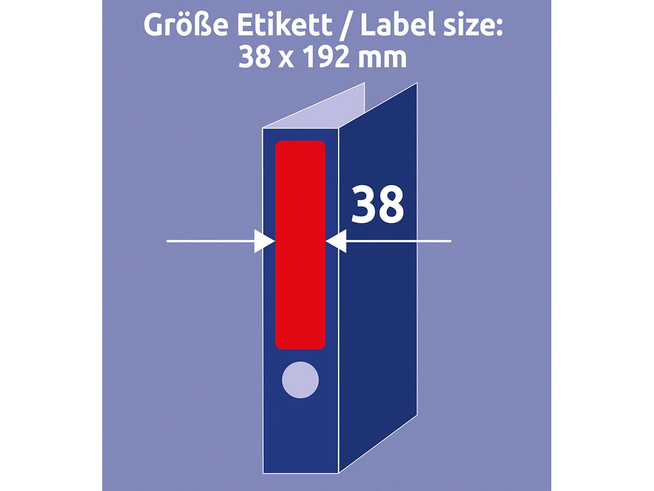 Die selbstklebenden Ordneretiketten sind für den Einsatz auf Kopierer, Tintenstrahl- und Laserdrucker geeignet. Format DIN A4. B 3,8 x H 19,2 cm. 1 Pack = 20 Blatt. Farbe rot.