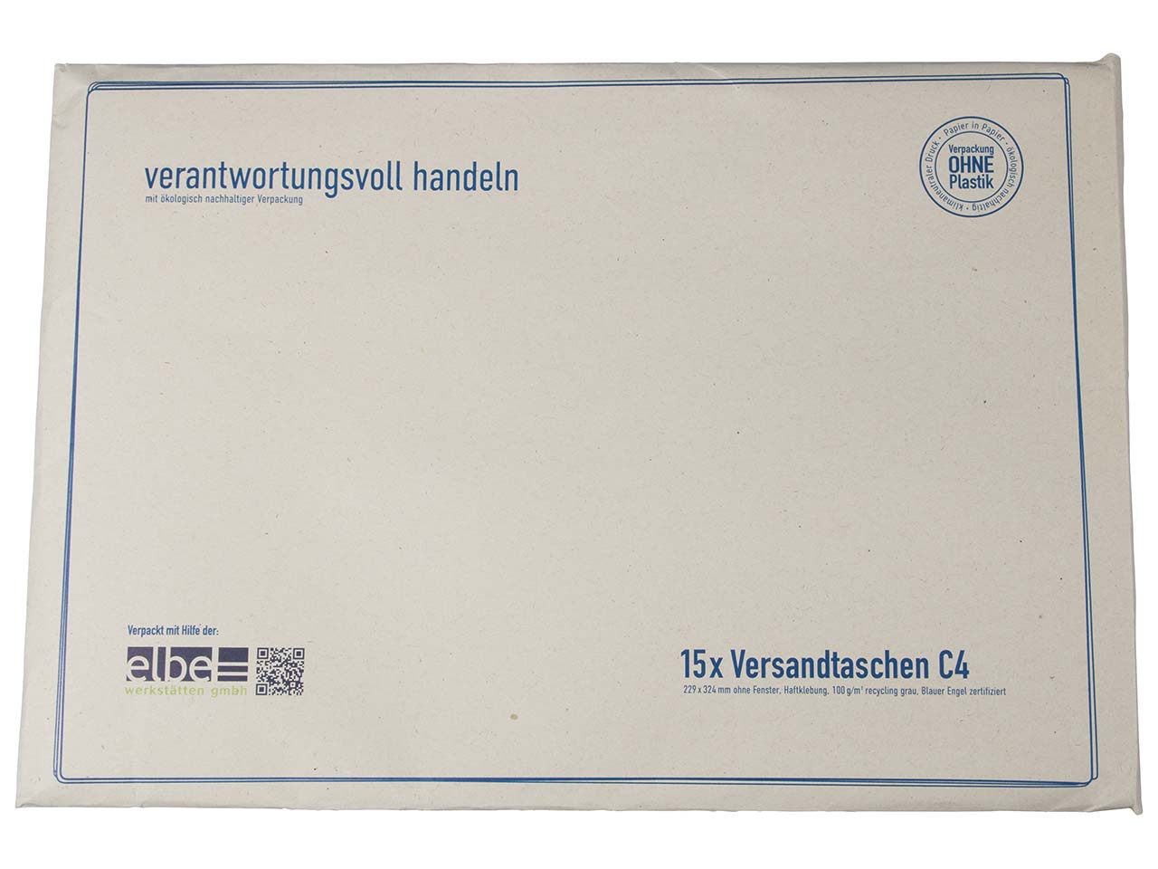 Jetzt kommt mehr Nachhaltigkeit in den Versand: Diese Versandtaschen sind aus Recyclingpapier gefertigt und mit dem Blauen Engel ausgezeichnet. Sie haben das Format C4 und eine Grammatur von 100 g/m², wodurch sie sich für verschiedene Einsatzzwecke eignen. Die Taschen ohne Fenster nutzen Haftklebung, die ihre Klebekraft bei sachgerechter Lagerung bis zu 4 Jahre lang behält. Nachhaltige Verpackung: Die Versandtaschen werden plastikfrei in einem bedruckten Umschlag aus Recyclingpapier verschickt! Die Konfektionierung erfolgt in den Elbewerkstätten (WfbM). 1 Pack = 15 Umschläge.
