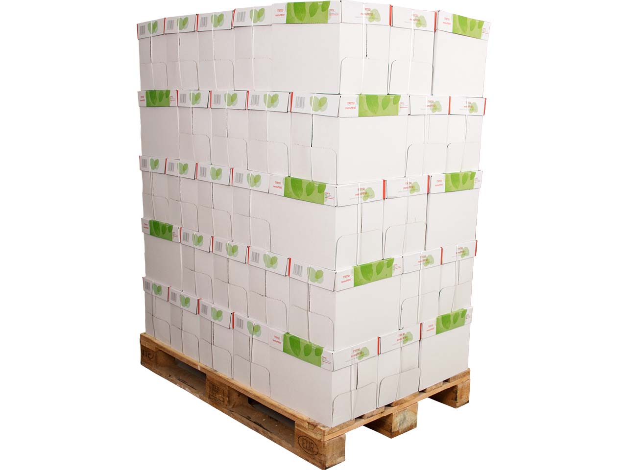 Eine Palette voller hochwertigem Recycling-Kopierpapier. Auch im Büroalltag das Klima schonen: Dieses hochwertige Recycling-Kopierpapier ist mit dem Blauen Engel ausgezeichnet und besteht zu 100 % aus Altpapier. Dieses Papier unserer "memoPRINT" Marke ist staubarm geschnitten, vorgewölbt und daher für Kopierer, Inkjet- und Laserdrucker optimal geeignet. Das Druckerpapier hat einen Weißegrad von 70 % nach ISO bzw. einen Wert von 58 nach CIE. Diese Werte wurden vollkommen ohne optische Aufheller und chlorhaltige Bleichmittel erzielt. Da der Weißegrad zwar geringer als bei Frischfaserpapier ausfällt, können jedoch große Mengen an Chemikalien und Wasser reduziert werden. Dieses Recyclingpapier hat eine reine und gleichmäßige Oberfläche. Für eine Lagerung ohne Qualitätsverlust ist das Kopierpapier in einer Klimaschutzverpackung aus feuchtigkeitsabweisendem Material mit einer wasserdampfundurchlässigen Sperrschicht verpackt. Das Kopierpapier ist alterungsbeständig nach DIN 6738-LDK 24-85. Format DIN A4, Grammatur 80 g/m². 1 Palette = 300 Pack = 150.000 Blatt.