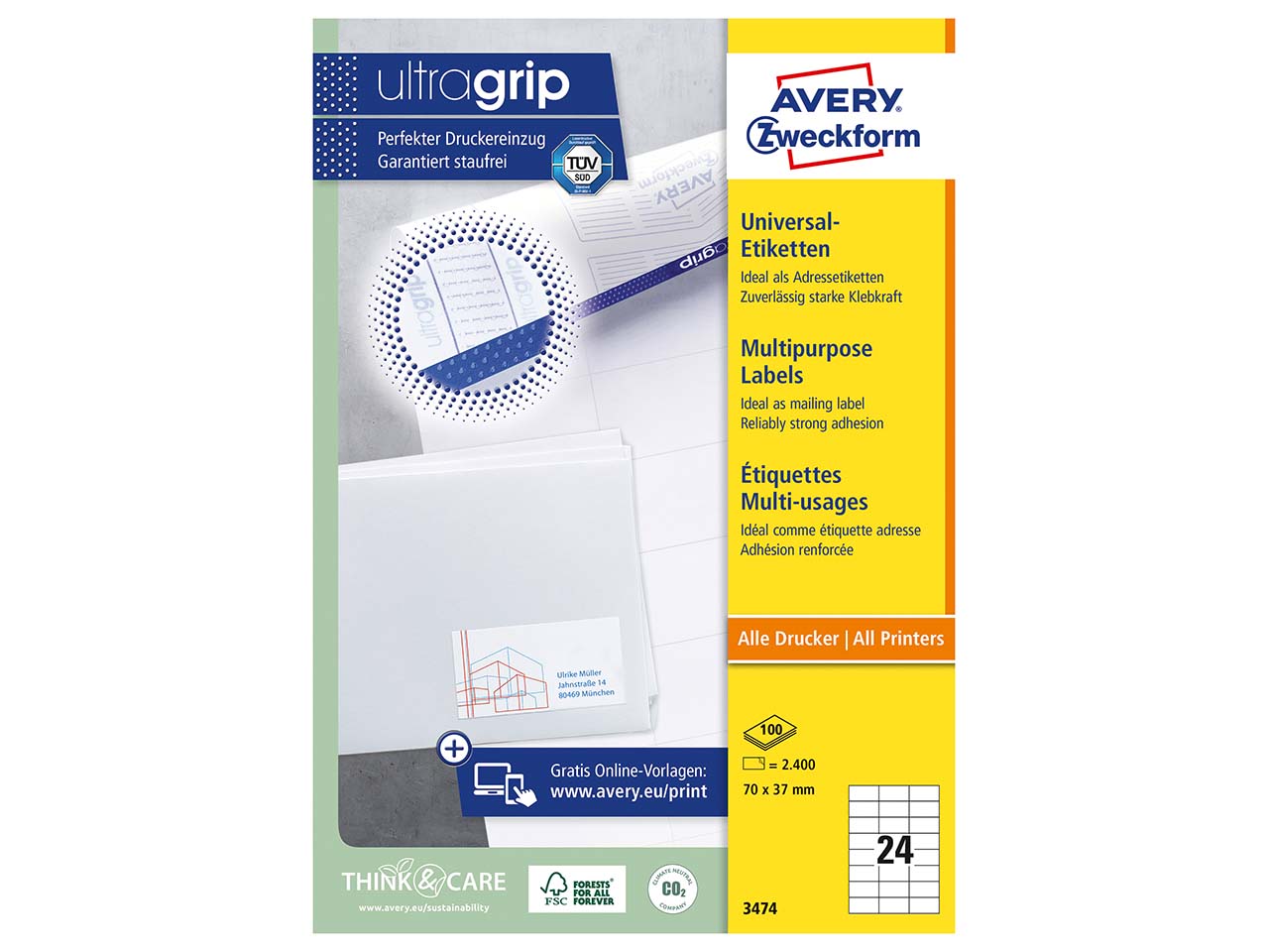 Die weißen Universaletiketten in bester Markenqualität von Avery Zweckform sind geeignet für Kopierer, Inkjet- und Laserdrucker. Das spezielle QCT-Verfahren garantiert optimale Ergebnisse, ohne Verwischen und unerwünschte Klebstoffablagerungen am Gerät. Die Adressetiketten sind passend für alle Kuvertgrößen - so kommt die Post sicher an. B 70 x H 37 mm. 1 Pack = 100 Blatt (2.400 Etiketten).