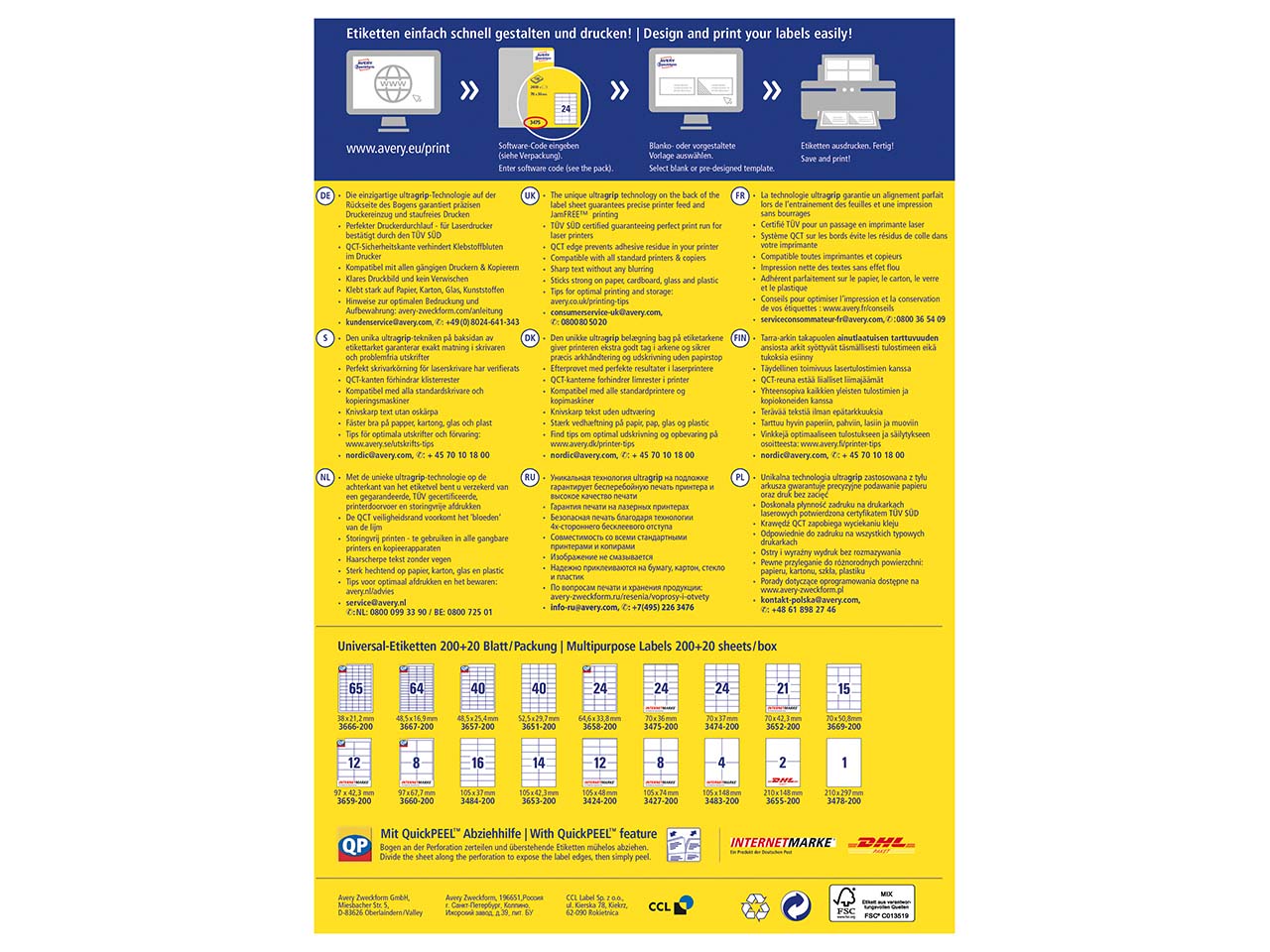 Die weißen Universaletiketten in bester Markenqualität von Avery Zweckform sind vielseitig verwendbar und geeignet für Kopierer, Inkjet- und Laserdrucker. Das spezielle QCT-Verfahren garantiert optimale Ergebnisse, ohne Verwischen und unerwünschte Klebstoffablagerungen am Gerät. Sie haften auf Papier, Kunststoff, Holz oder Stoff und bieten damit viel kreativen Gestaltungsspielraum. B 105 x H 48 mm.