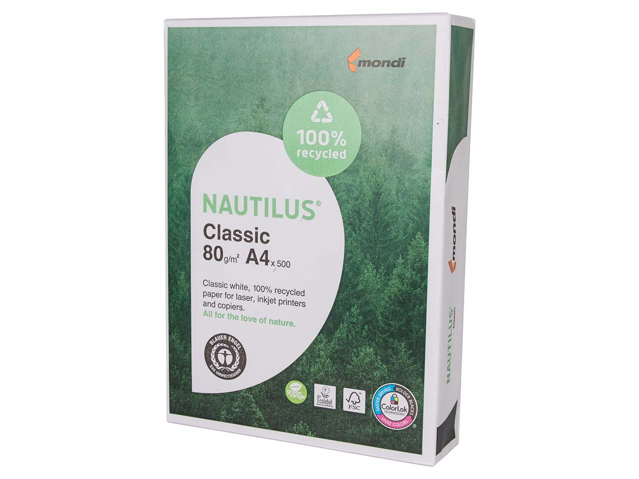 Papiervorrat für Büros mit hohem Verbrauch: Das Recycling-Kopierpapier "Nautilus Classic" mit einem Weißegrad von 88 % nach ISO entsteht ohne chlorhaltige Stoffe oder optische Aufheller und bietet auf allen Kopierern sowie Inkjet- und Laserdruckern optimale Laufeigenschaften. Das Kopierpapier trägt den Blauen Engel und ist mit dem EU Ecolabel ausgezeichnet. Die besonders hohe Reinheit und Gleichmäßigkeit des Recyclingpapiers entsteht durch die hochwertige Altpapiersortierung und ein spezielles De-Inking-Verfahren. Das universell verwendbare Kopierpapier auf Niveau von Primärfaserpapier erfüllt die DIN 6738 für höchste Alterungsbeständigkeit und ist aufgrund des hohen Faserstoffanteils stabil und hitzebeständig. 1 Palette = 200 x 500 Blatt.