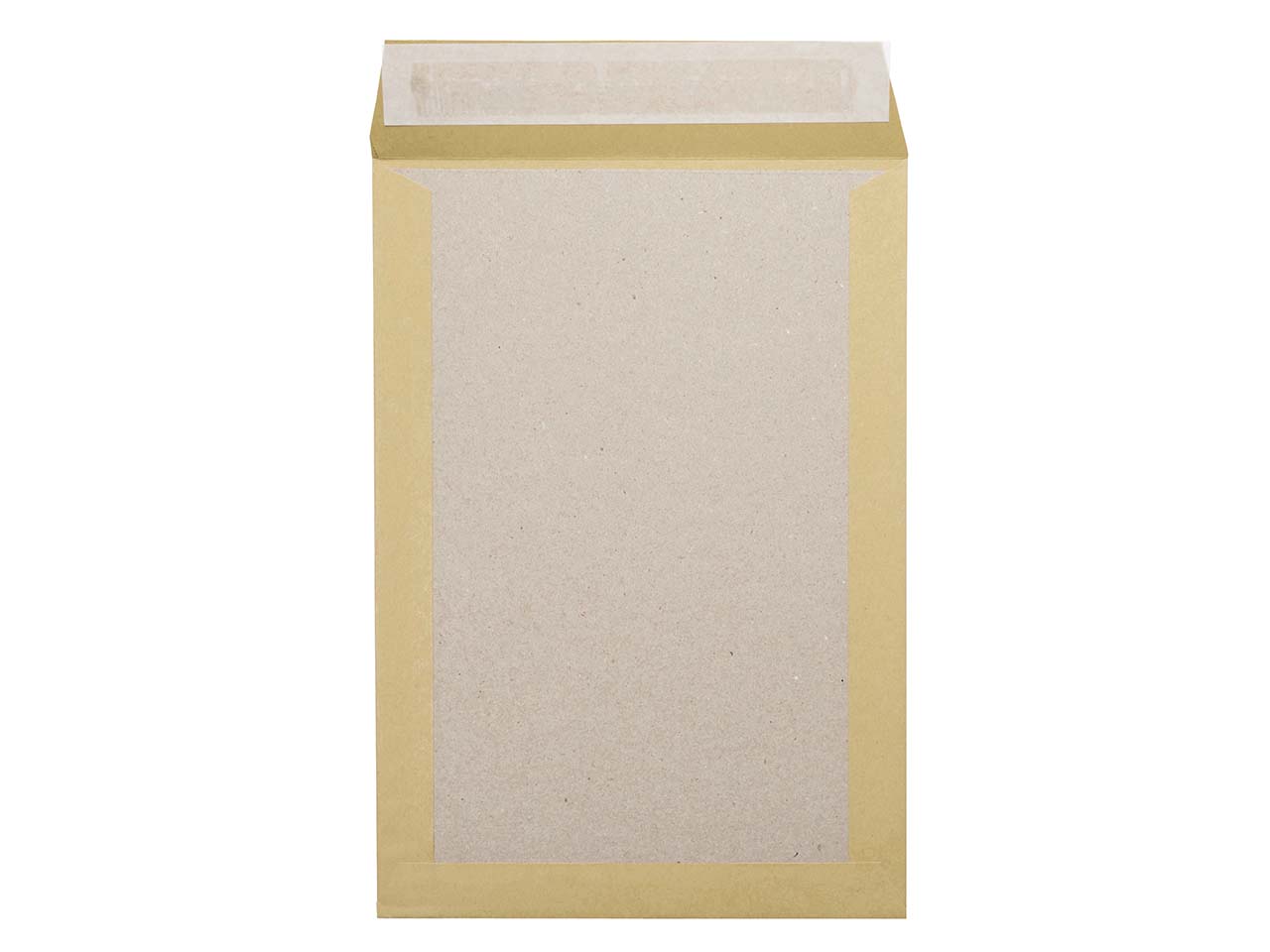 Die Rückwand der Versandtaschen besteht aus stabiler, grauer Recyclinghartpappe.