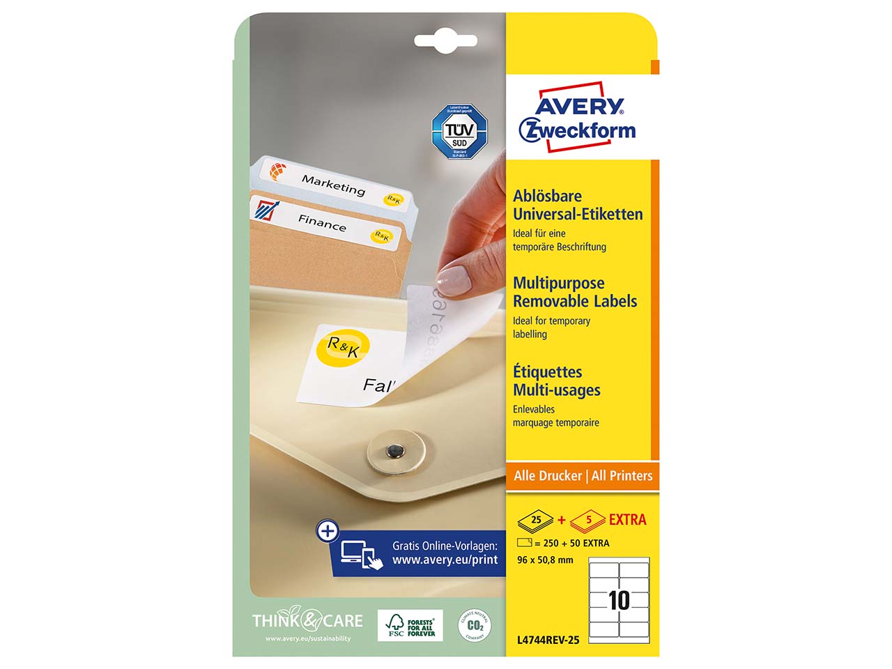 Jetzt gratis 20 % mehr Inhalt: Die Avery Zweckform Etiketten sind für Kopierer, Inkjet- und Laserdrucker geeignet. Sie sind fest haftend und dennoch wieder ablösbar. Die Etiketten können rückstandlos wieder entfernt werden und sind somit vor allem für eine temporäre oder häufig wechselnde Kennzeichnung ideal. Inkl. Online-Software und Vorlagen. B 96 x H 50,8 mm. 1 Pack = 250 + 50 Etiketten.