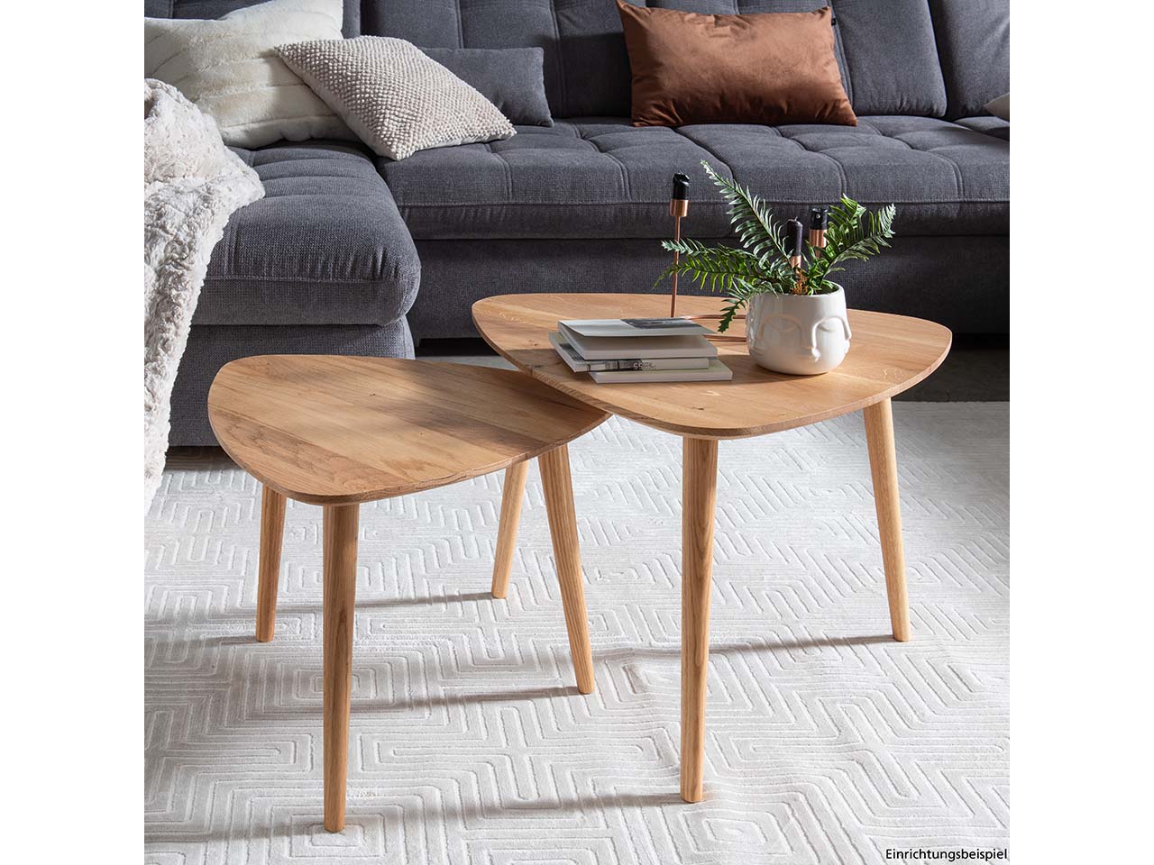 Diese zwei Beistelltische bringen Natürlichkeit in Wohnräume. Sie sind vollständig aus massiver, FSC-zertifizierter Wildeiche gefertigt und punkten mit ihrer immer wieder einzigartigen Maserung. Durch die Schweizer Kante, bei der sich die Kante von oben nach unten in einem bestimmten Winkel (hier 60°) verjüngt, sorgt dafür, dass die Tische nicht wuchtig wirken. Ideal für kleinere Räume! Im Design sind die Tische minimalistisch und modern gehalten. B 60 x T 60 x H 43 cm und B 50 x T 50 x H 38 cm.