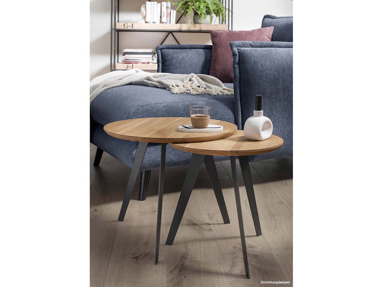 Eine runde Sache: Die runden Beistelltische sind ein perfektes Set, das immer wieder nach den eigenen Bedürfnissen angepasst werden kann. Der niedrigere Tisch passt genau unter den höheren, sodass sich viele Stellmöglichkeiten ergeben. Im Design sind die Beistelltische natürlich und elegant gehalten: Die moderne Natürlichkeit entsteht durch die Kombination aus massiver, FSC-zertifizierter Wildeiche und schwarz pulverbeschichtetem Stahl. Die Tische sind langlebig und bereiten über viele Jahre Freude. B 50 x T 50 x H 40 cm und B 40 x T 40 x H 38 cm.
