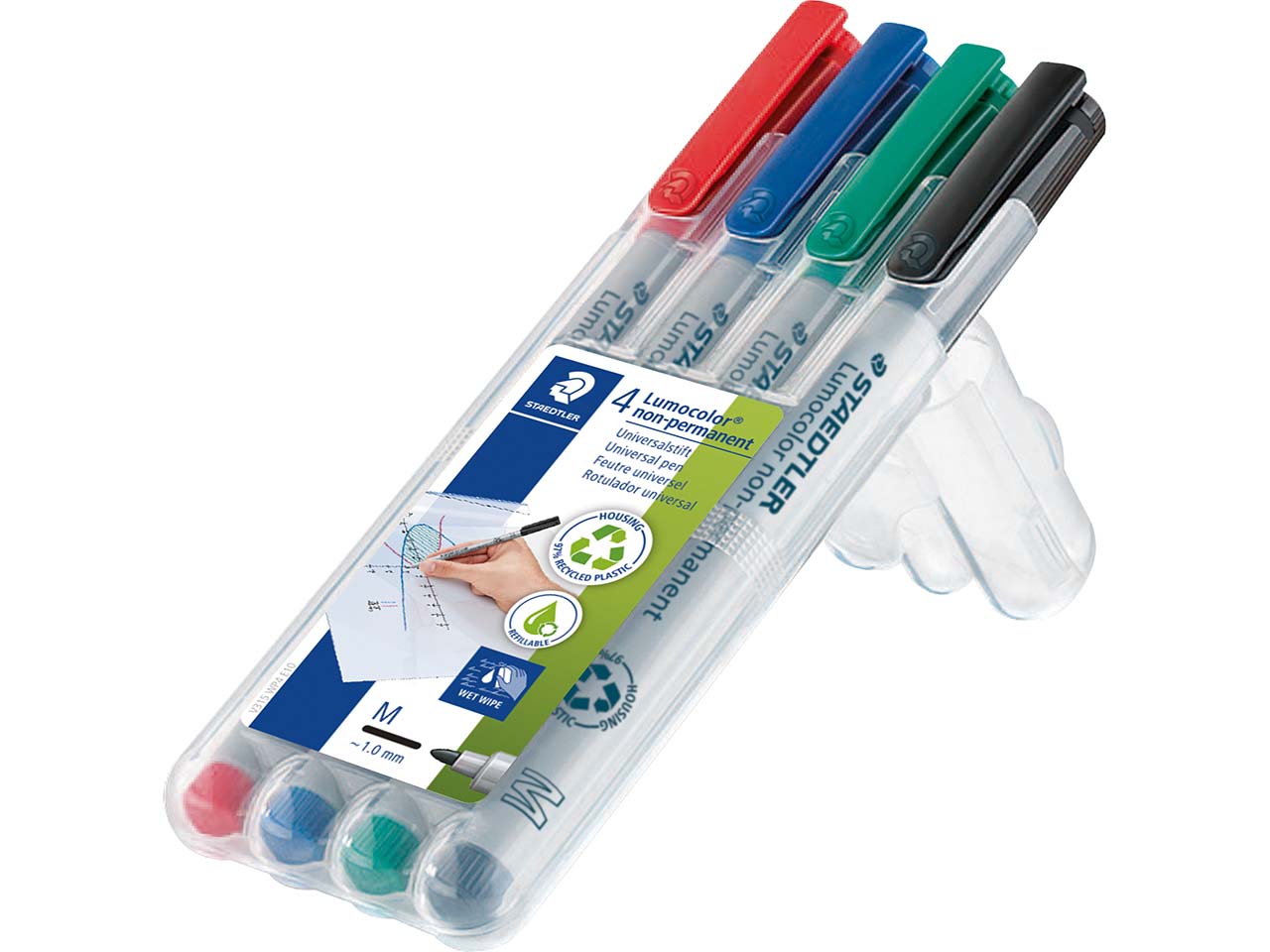 Die STAEDTLER Universalstifte "Lumocolor" in der 4er-Box sind kleine Multitalente und für den universellen Einsatz ideal. Schaft und Kappe bestehen aus recycelbarem Polypropylen. Die nachfüllbare Tinte ist auf Alkoholbasis hergestellt, abwaschbar und geruchsarm. Mit Rundspitze. Strichstärke 1 mm. Länge 15,1 cm. 1 Pack. = 4 Stk. Farbig sortiert.