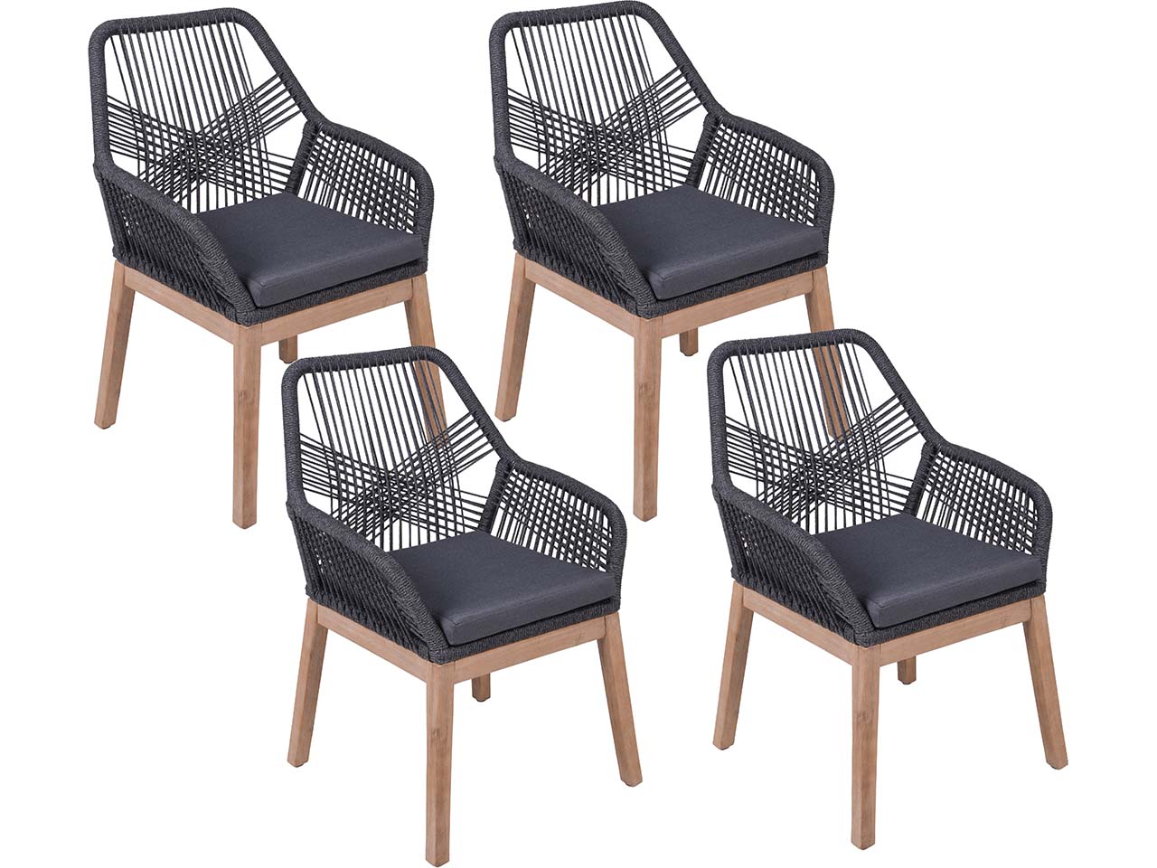 Rustikale Augenweide im praktischen 4er-Pack: Dieser Gartenstuhl zeigt auf beeindruckende Weise, wie natürliche Elemente mit modernem Design harmonieren. Die Beine bestehen aus FSC-zertifiziertem Akazienholz und verströmen eine natürliche Eleganz. Der Sitzbereich besteht aus robuster, langlebiger Seilbespannung. Diese charmante, raffinierte Kombination macht den Gartenstuhl zu einer wunderbaren Ergänzung auf dem Balkon, im Garten oder auf der Terrasse. Eine Auflage sorgt für noch mehr Sitzkomfort.