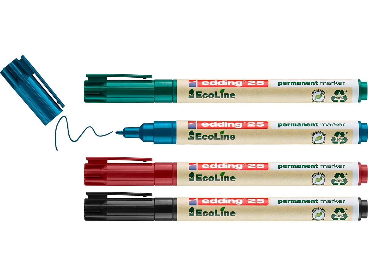 Mit den Permanent-Markern der edding EcoLine-Serie lassen sich fast alle Materialien beschriften, kennzeichnen oder markieren. Dazu gehören beispielsweise Glas, Kunststoff, Karton, Papier oder Metall. Die edding EcoLine Permanent-Marker 25 enthalten geruchsarme Tinte, die zudem wasserfest und abriebbeständig ist. Zu 90 % sind die Schäfte, Spitzen und Kappen der edding EcoLine Permanent-Marker 25 aus recyceltem Material hergestellt. 1 Pack = 4 Stk.