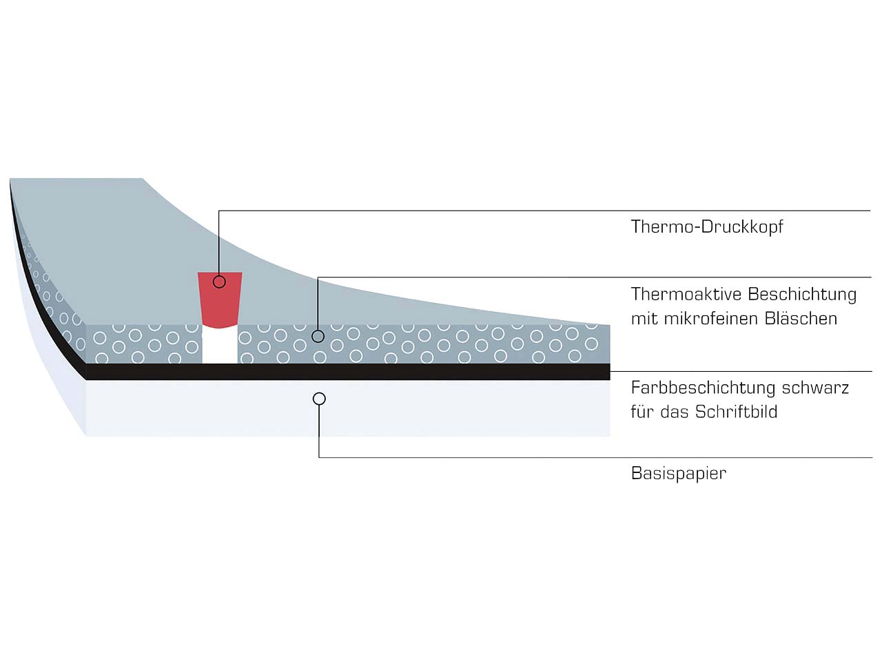 Für die Herstellung wird das FSC-zertifizierte Basispapier mit einer schwarzen Farbschicht überzogen. Die darüber liegende opake Beschichtung reagiert dann schließlich auf die Hitze des Thermodruckkopfs. Es handelt sich dabei um eine rein physikalische Reaktion, denn die in der Beschichtung enthaltenen Bläschen zerfallen durch die Hitzeeinwirkung, wodurch die schwarze Schicht als Schrift auf der Quittung sichtbar wird.