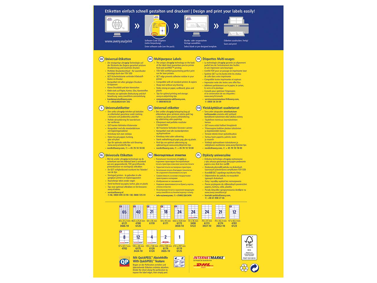 Avery Zweckform garantierten mit Forschung, Entwicklung, Produktion, Logistik und Verwaltung am Firmenstandort in Bayern höchste Qualitätsstandards. Das Obermaterial der chlorfrei gebleichten Etiketten besteht zu 100 % aus FSC-zertifiziertem Papier aus nachhaltig bewirtschafteten Wäldern. Der Forest Stewardship Council (FSC) ist eine gemeinnützige Organisation, die sich weltweit für eine ökologische und sozialverträgliche Waldbewirtschaftung und damit gegen den Raubbau unserer Wälder einsetzt. Nur Produkte, die strenge Kriterien erfüllen und deren Rohstoffe unabhängig zertifiziert sind, erhalten das FSC-Siegel.