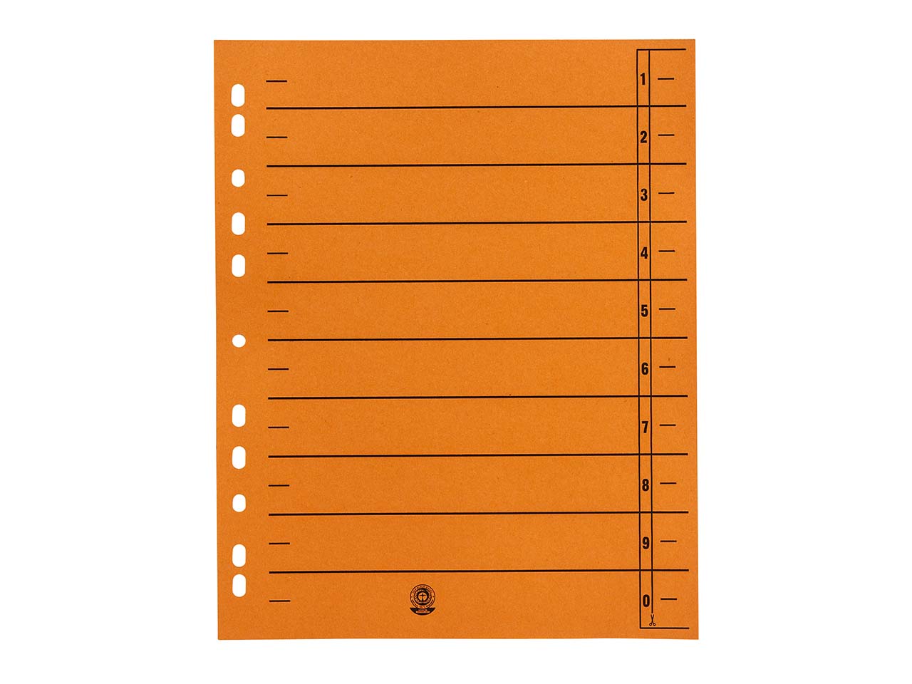50 Trennblätter aus Recyclingkarton (230 g/m²), mit Euro-Lochung und schwarzem Randdruck. Ausgezeichnet mit dem Blauem Engel. Für Format DIN A4. 1 Pack = 50 Stk. Farbe orange.