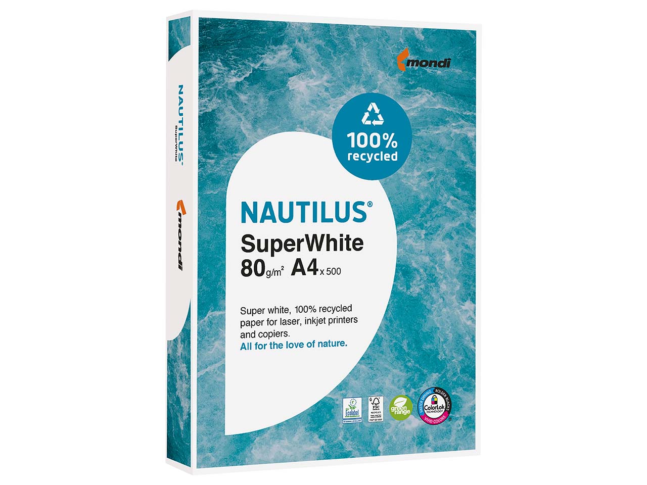 Die Spitzenqualität "Nautilus Super White" vereint den Vorteil extra hoher Weiße mit den ökologischen Vorteilen von Recyclingpapier. Sehr gute Laufeigenschaften. Geeignet für die dauerhafte Archivierung durch höchste Alterungsbeständigkeit. Format DIN A4, Grammatur 80 g/m². 1 Pack = 500 Blatt.