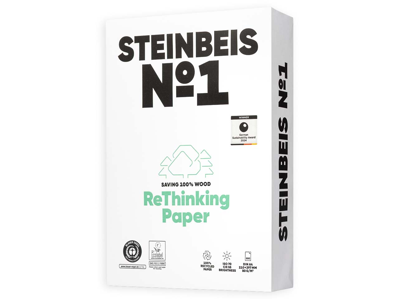 Als europäischer Marktführer auf dem Gebiet der Recyclingpapiere aus 100 % Altpapier setzt Steinbeis bei der Herstellung auf Energieeffizienz sowie Umwelt- und Ressourcenschonung. Bei dem nach neuestem Stand der Technik eingesetzten De-Inking-Verfahren werden ausschließlich Hilfsstoffe eingesetzt, die den Kriterien des Blauen Engels entsprechen. Die Steinbeis Papiere durchlaufen strenge Qualitätskontrollen, externe unabhängige Institute überwachen die Funktionalität. Das Umweltzeichen Blauer Engel garantiert die Erfüllung hoher Standards unter Berücksichtigung aller ökologischer Einflussfaktoren und wird u.a. für Druck- und Kopierpapiere mit einem Altpapier-Anteil von 100 % vergeben. Zudem muss das Material mindestens 65 % "untere und mittlere Sorten" (wie Haushaltsabfälle) enthalten. Chlorhaltige Bleichmittel und optische Aufheller sind nicht erlaubt.
