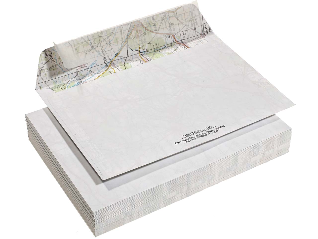 Hinweis: Bei der Produktion der DRP Briefumschläge mit innenliegender Karte wird die gesamte Landkarte recycelt. Aus diesem Grund kann es vorkommen, dass die abgebildeten Karten auch Legenden enthalten. Die Varianten mit der Karten außen werden handverlesen und sind immer mit einem Kartenaufdruck.