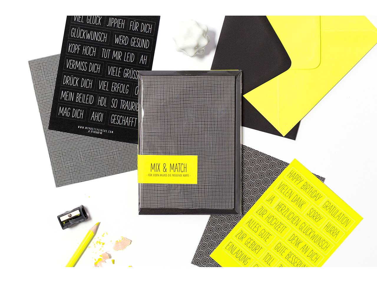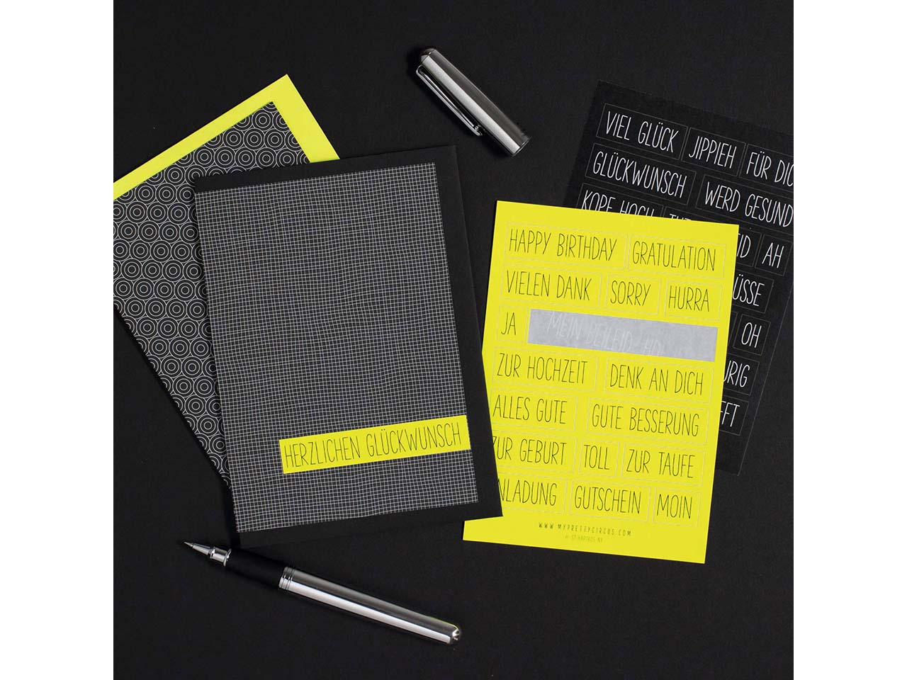 | Inhalt: | 3 Recycling Grußkarten Net- Black, 3 Recycling Grußkarten Circles, 3 schwarze recycling Briefumschläge, 3 gelb FSC Briefumschläge, 2 Stickerbögen |