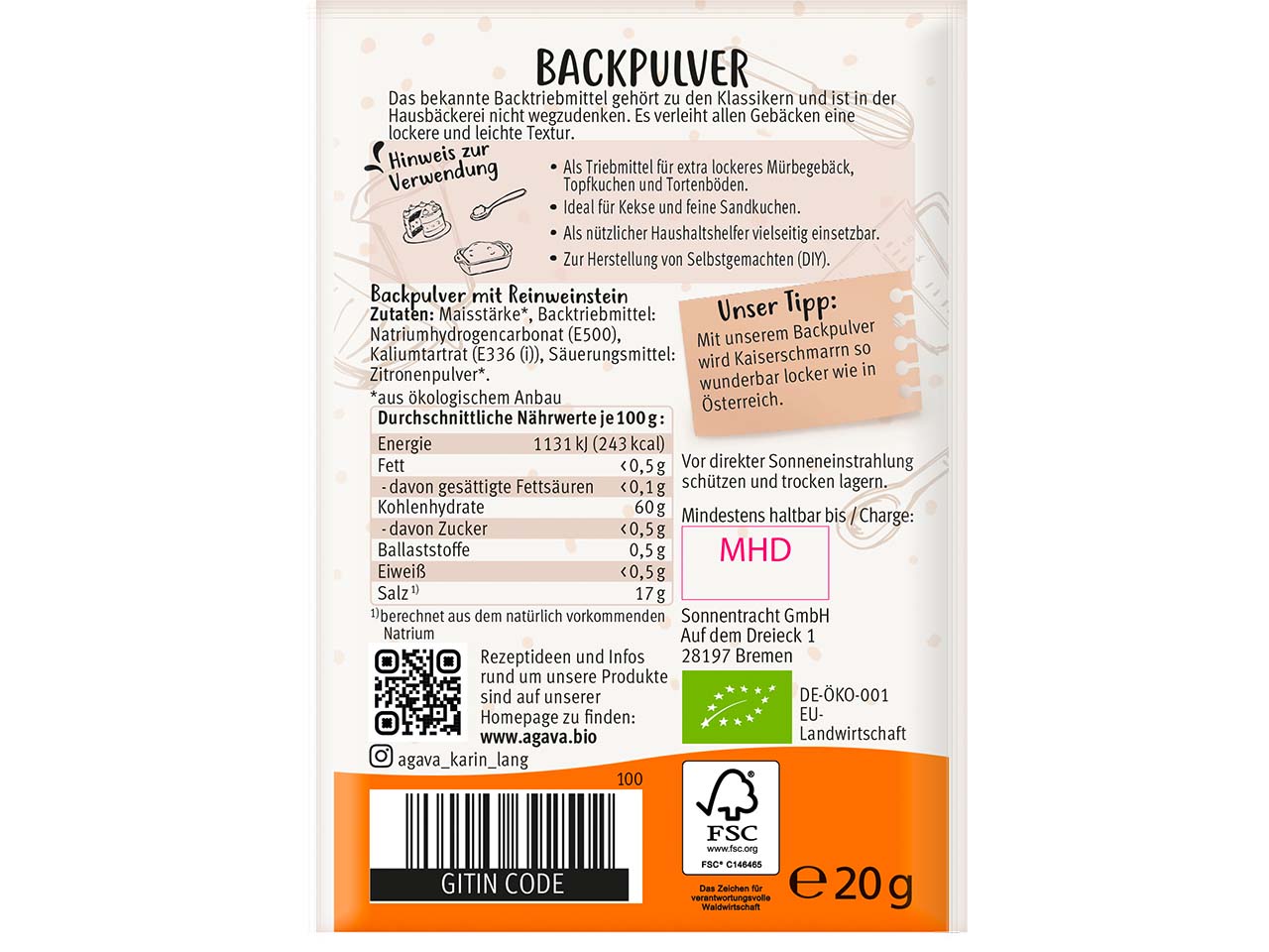 Backpulver ist ein echter Klassiker der Backzutaten und darf in keinem Haushalt fehlen. Es enthält Reinweinstein und eignet sich wunderbar als Triebmittel für extra lockeres Mürbegebäck, Tortenböden oder Sandkuchen. Alternativ kann das Backpulver in Bio-Qualität auch als universeller Haushaltshelfer, z.B. zum Putzen eingesetzt werden. Inhalt 3 x 20 g.
