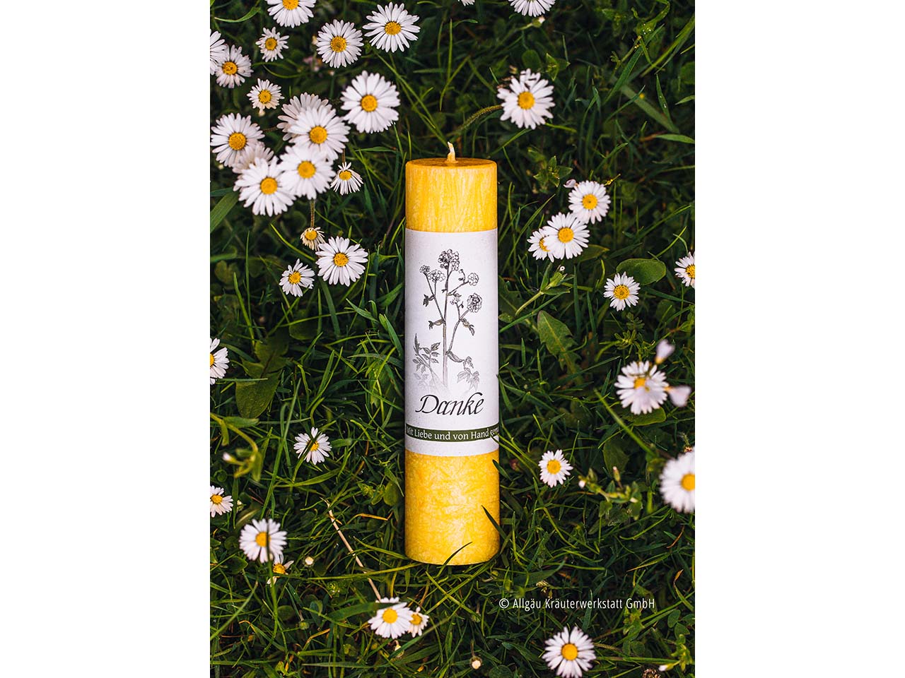 Den Liebsten ein Danke schenken: Die in Deutschland hergestellte Heilkräuter-Kerze aus pflanzlichem Stearin erinnert mit Gänseblümchen, Ringelblume und Sonnenblume an einen frischen Strauß Blumen. Die Inhaltsstoffe drücken Dank aus und sollen Freude bringen. Besonders nachhaltig: Die Kerze hat eine Brenndauer von bis zu 40 Stunden. Der enthaltende Salbei wirkt sich zudem reinigend auf Körper und Geist aus. H 190 mm.