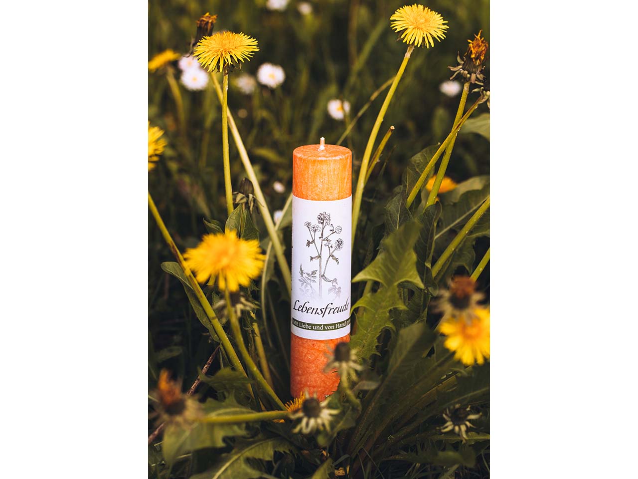 In einer kleinen Manufaktur in den Allgäuer Alpen wird diese wunderschöne Kerze in liebevoller Handarbeit gefertigt. Sonnenblume, Gänseblümchen, Ringelblume und Johanniskraut stecken in ihr und vertreiben mir ihrem sonnigen Gemüt Melancholie. Zusammen mit den abgestimmten ätherischen Ölen wie Grapefruit schenkt die Kerze Freude, Heiterkeit und Lebendigkeit. Die Kerze hat eine Brenndauer von bis zu 40 Stunden und ist so ein langlebiger Begleiter für alle Lebenslagen. H 190 mm.