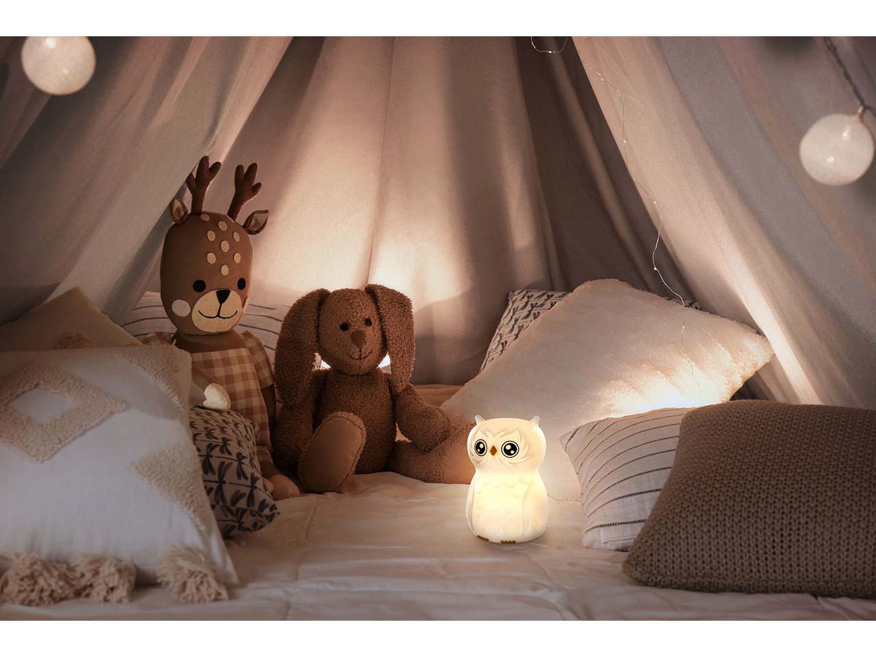 Diese niedliche Eule leistet Kindern abends Gesellschaft, bis sie einschlafen! Das Nachtlicht aus Silikon findet auf jedem Nachttisch Platz und sorgt für eine angenehme, sanfte Beleuchtung im Kinderzimmer, die beim Einschlafen helfen kann. Batterien oder Strom braucht die Leuchte nicht – sie funktioniert über Akku und kann so immer wieder aufgeladen werden. Sie eignet sich für den mobilen Einsatz und kann mit in den Urlaub, um eine gewohnte Umgebung zu schaffen. Dank der LED-Technologie ist der Energieverbrauch gering und die Leuchte erwärmt sich selbst bei längerem Gebrauch nicht. Die Abschaltautomatik schaltet das Licht nach 60 Minuten automatisch aus. Es sind verschiedene Lichtfarben wählbar und dimmbar ist das Akku-Nachtlicht ebenfalls. L 9,2 x B 9,9 x H 13,7 cm.