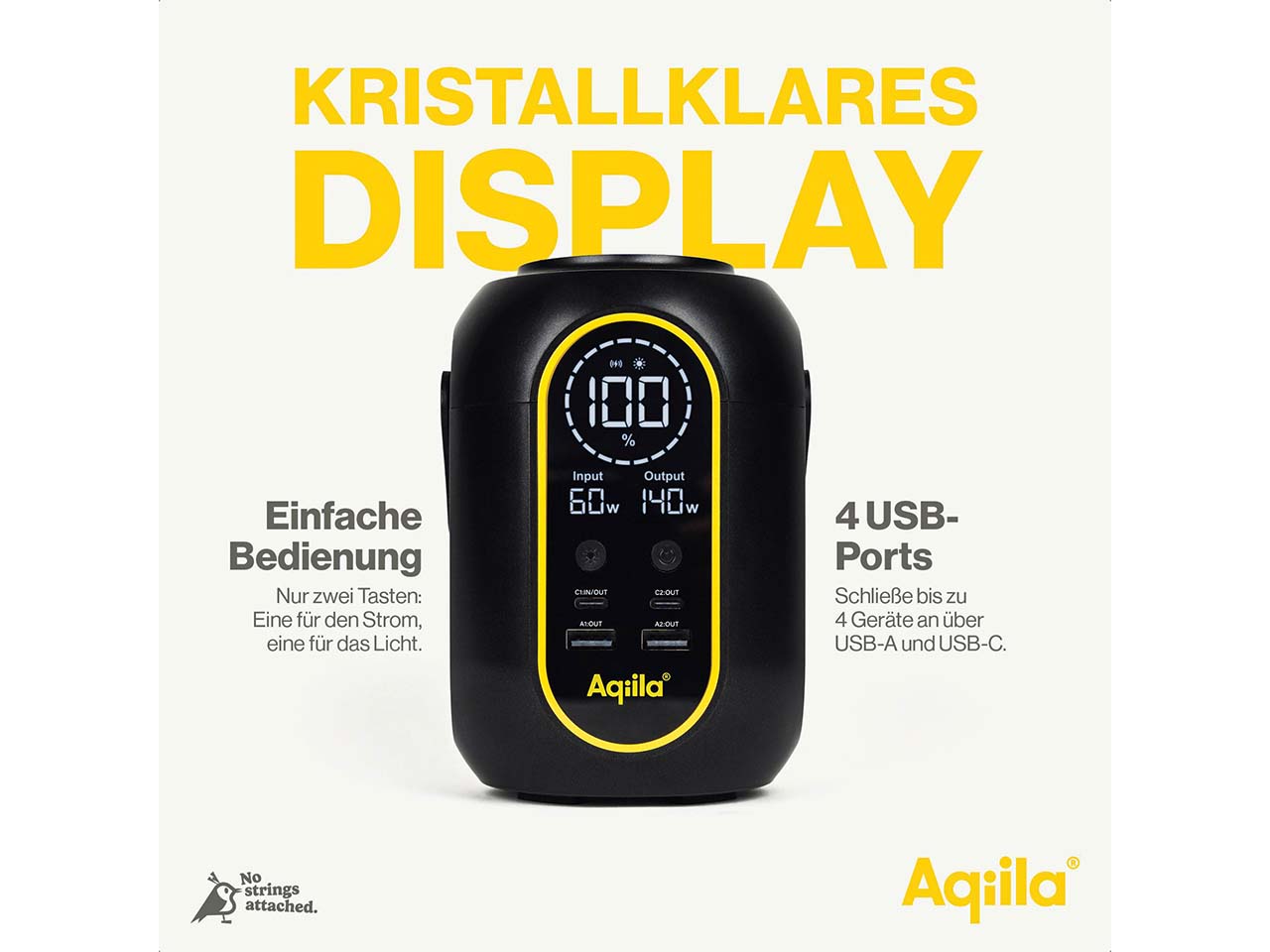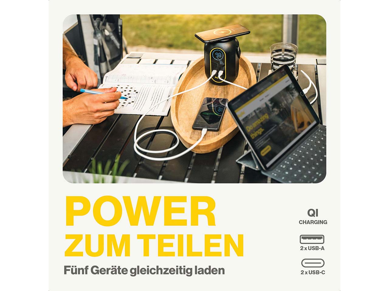 Darf beim nächsten Campingausflug auf keinen Fall fehlen: Die kompakte Powerstation mit 54.000 mAh lädt Geräte wie Smartphone und Co. zuverlässig auf. Über den LCD-Bildschirm ist die verbleibende Kapazität jederzeit übersichtlich ablesbar. Neben den zwei USB-C- und USB-A-Anschlüssen ist ein drahtloses, induktives Aufladen möglich. Dabei lädt die tragbare Powerstation bis zu vier Geräte gleichzeitig. Das integrierte Licht ist ein praktisches Highlight. Dadurch kann die Powerbank wie eine Laterne benutzt werden. Sie gibt Licht zwischen 50 und 200 Lumen. Der Tragegriff macht den Transport kinderleicht und komfortabel.