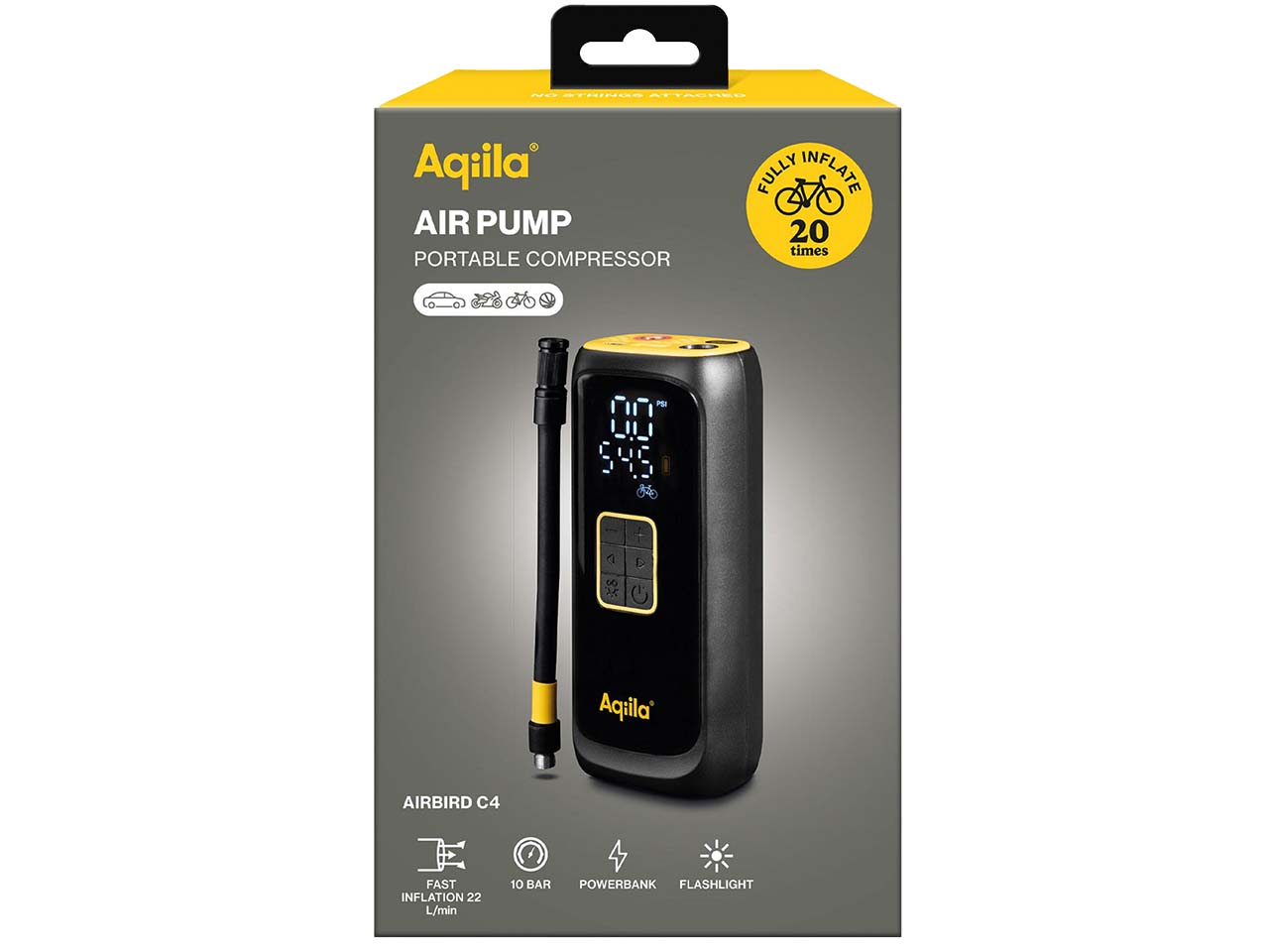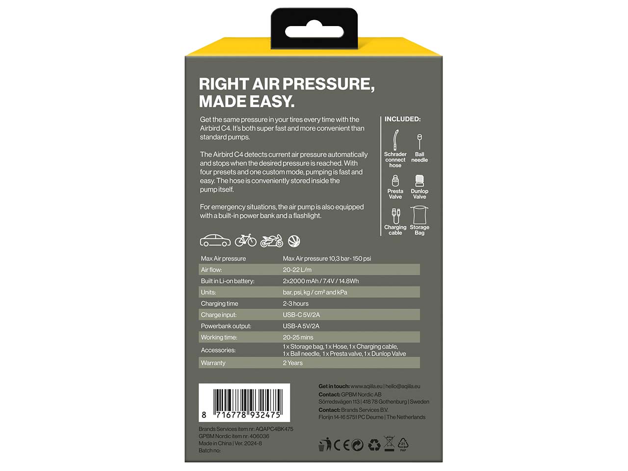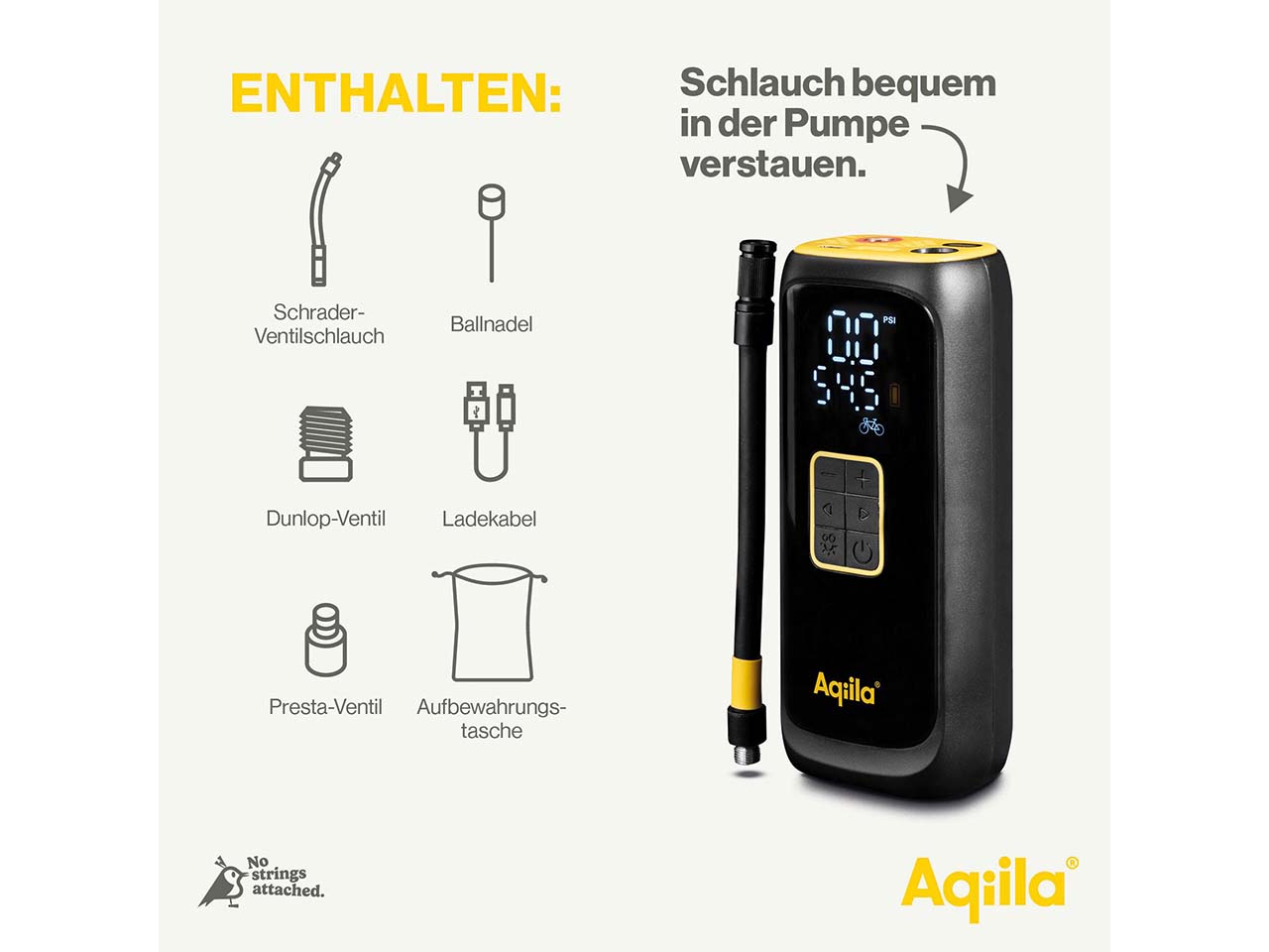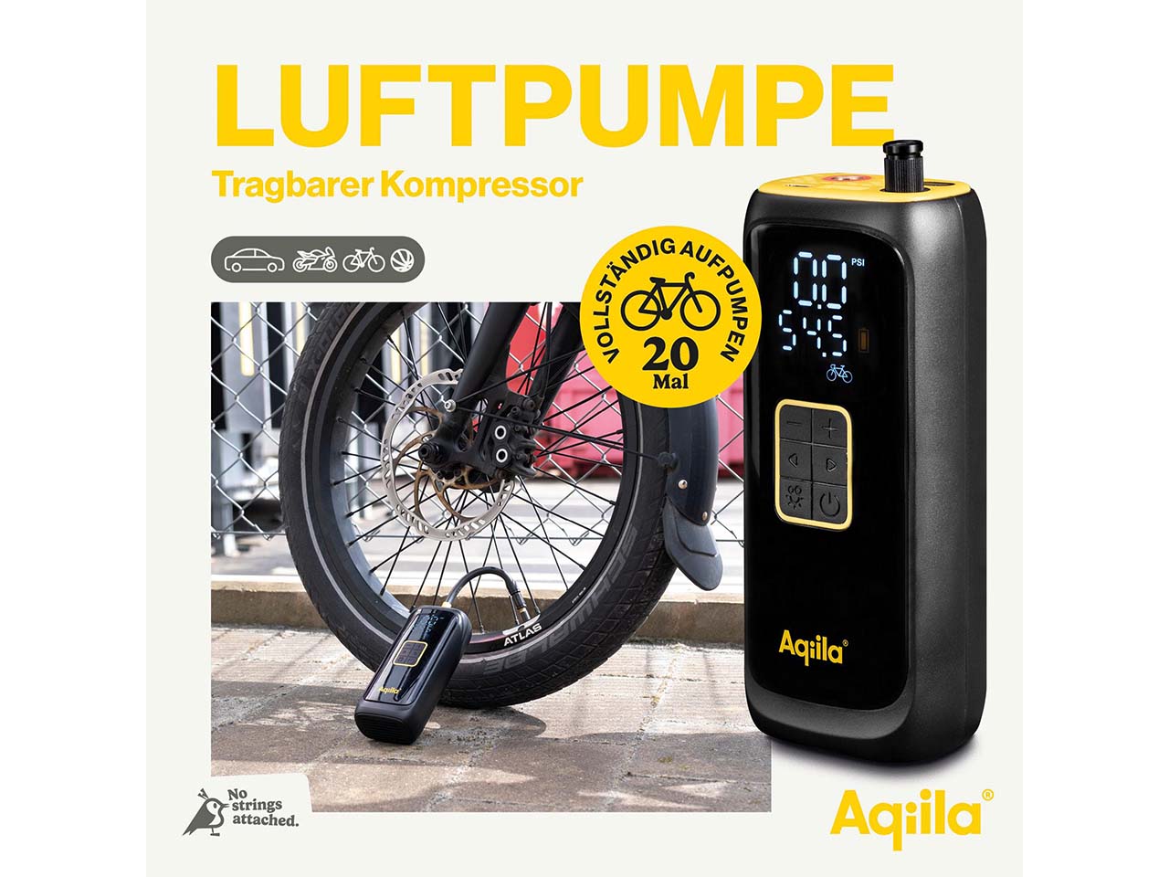 | Lieferumfang: | Akku Kompressor "Airbird C4", Aufbewahrungstasche, USB-C Kabel, Schrader-Ventilschlauch, Ballnadel, Dunlop-Ventil, Presta-Ventil, Handbuch |
