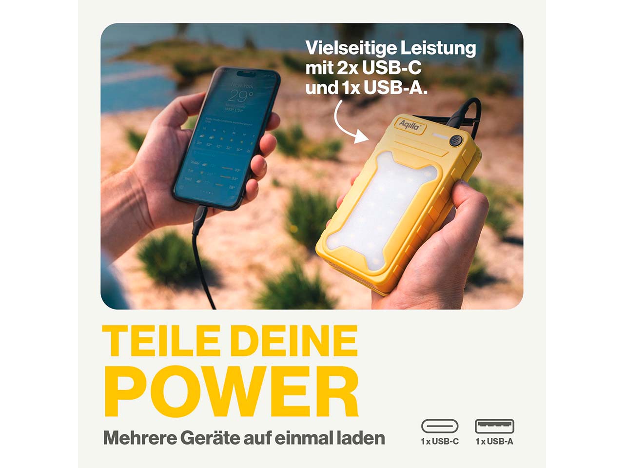 Die Kraft der Sonne nutzen, damit die Energie bei keinem Abenteuer ausgeht! Die robuste Powerbank ist ein kleines Kraftpaket mit 10.000 mAh, das Smartphone und Co. effektiv auflädt. Das integrierte, faltbare Solarpanel speichert das Sonnenlicht und wandelt es in Strom um, sodass man im richtigen Moment immer Zugriff auf Strom hat – ganz flexibel und unabhängig von den Begebenheiten. Die wasserdichte Powerbank ist ein praktischer Begleiter beim Campen, auf Reisen und Tagestouren. Über einen Karabiner kann sie ganz leicht am Rucksack befestigt werden. Die Powerbank hat eine Leuchte integriert, die mit bis zu 100 Lumen den Weg weist, wenn es dunkel ist.