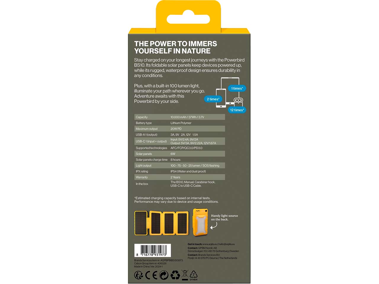 | Lieferumfang: | Powerbank mit Solarpanel "Powerbird BS10", Karabinerhaken, USB-C auf USB-C Kabel |