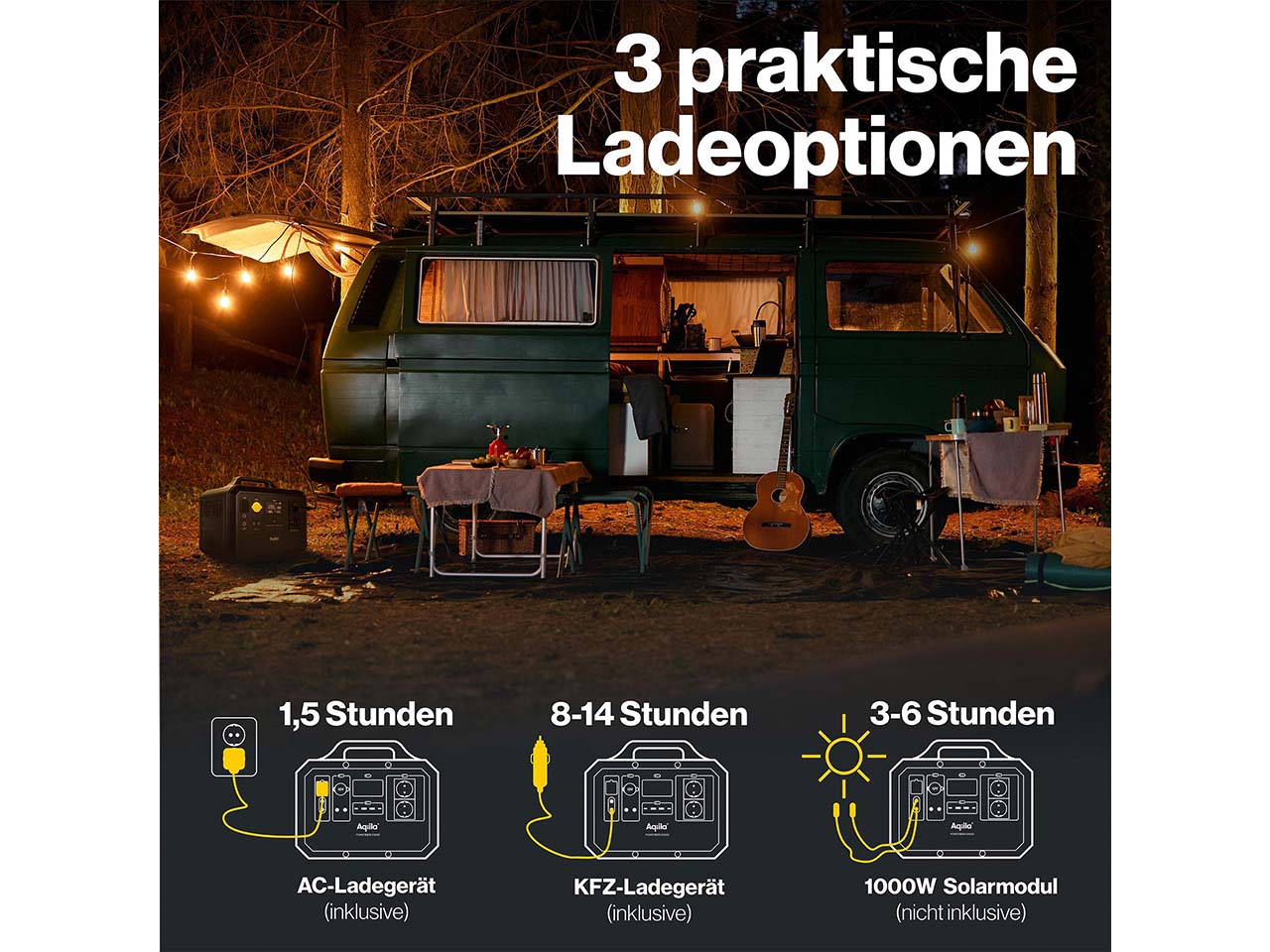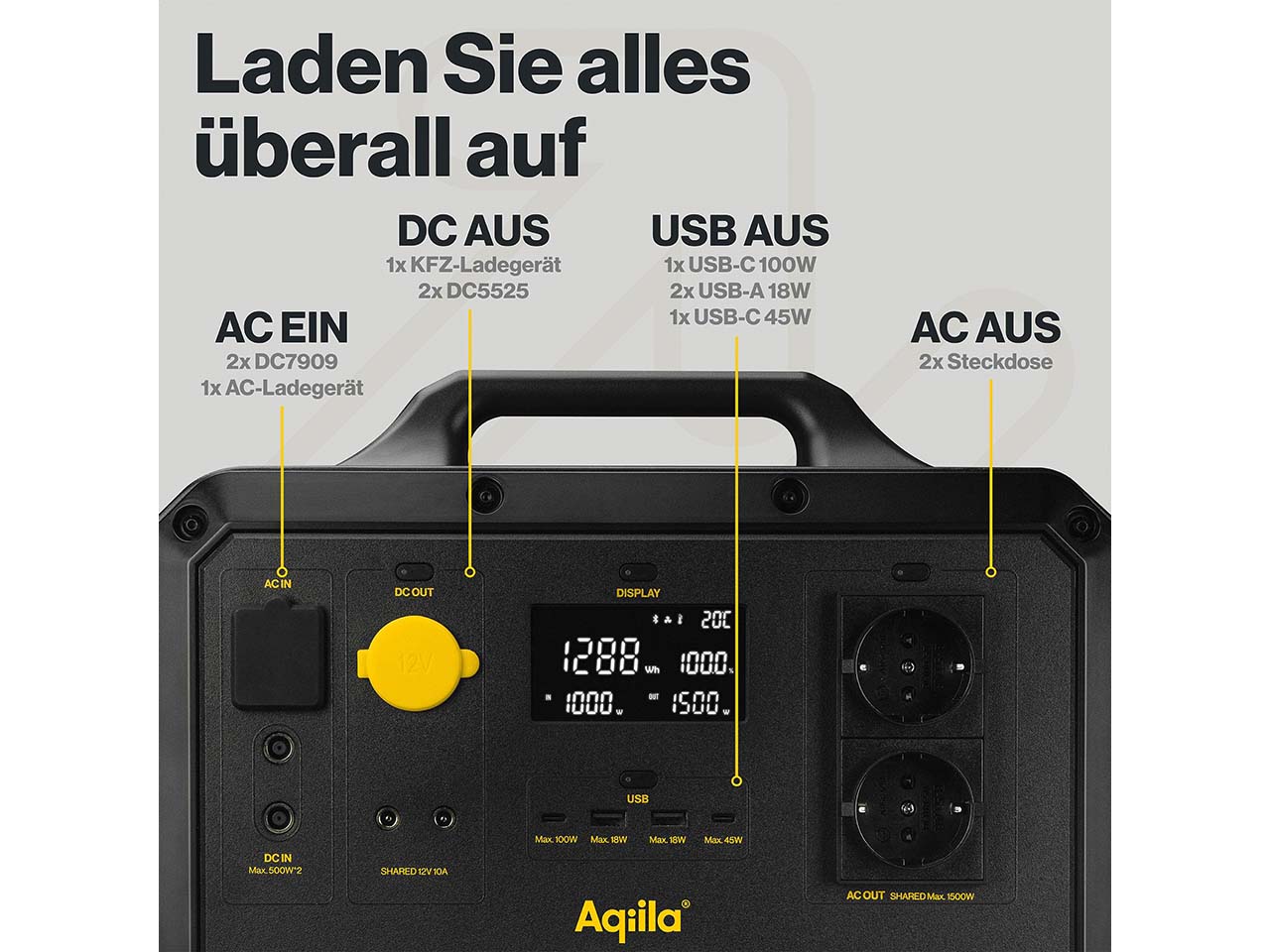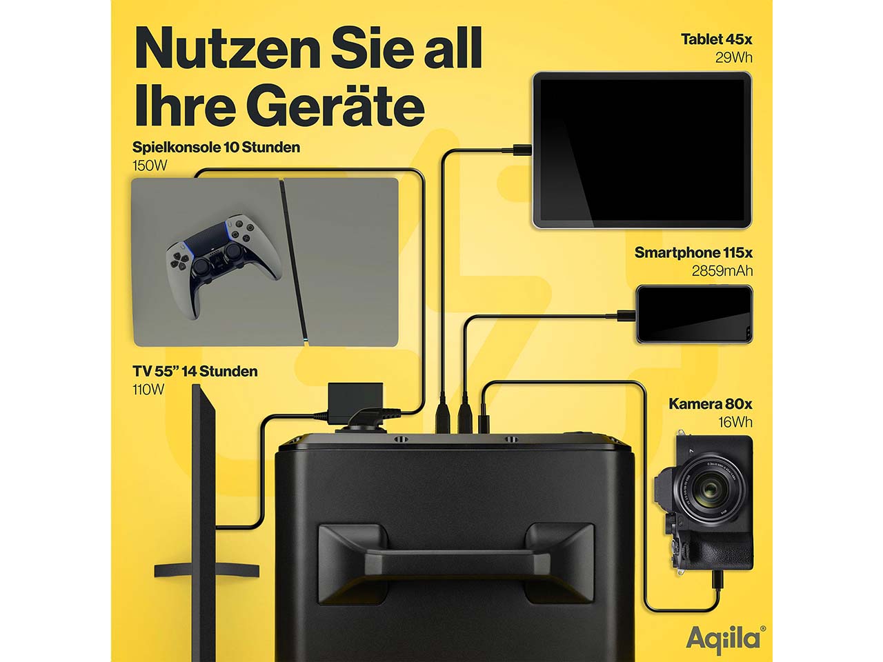 - Mit vielen Ein- und Ausgängen zum Aufladen und Betreiben von Geräten