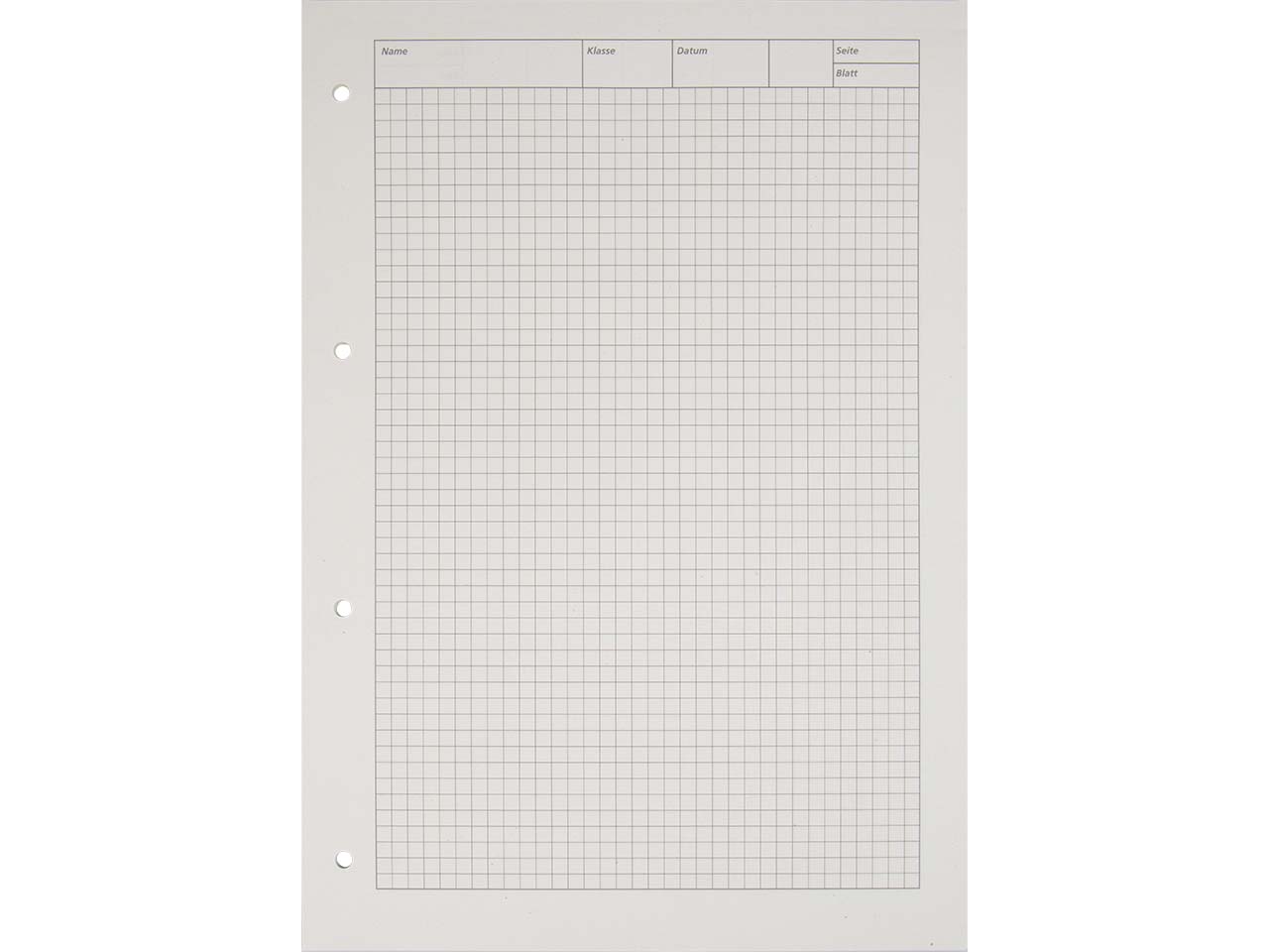 Arbeitsblock aus naturweißem Recyclingpapier. Der karierte Schreibblock hat eine Kopfzeile für Namen, Klasse und Datum. 4-fach gelocht zum einfachen Abheften und ohne Randlinien. Weißegrad 80 % nach ISO. 50 Blatt, Format DIN A4, Grammatur 70 g/m².