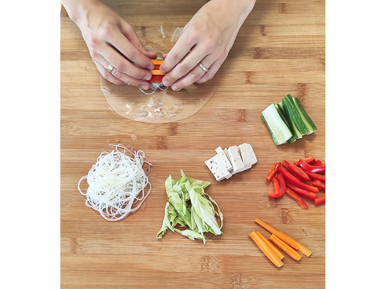 Zeit für Fingerfood! Frühlingsrollen gehören zu den beliebtesten asiatischen Snacks überhaupt. Das ist auch kein Wunder, denn sie sind schnell zubereitet und einfach lecker. Mit diesem Reispapier in Bio-Qualität klappts auf jeden Fall mit dem beliebten Fingerfood. Jedes Blatt hat 18 cm Durchmesser und somit viel Platz für alles, was schmeckt. Der kulinarischen Fantasie sind dabei keine Grenzen gesetzt! Die Reispapierblätter lassen sich mit Gemüse wie Möhren und Sprossen oder auch mit Fleisch, Fisch, etc. befüllen. Das Beste: Das Reispapier kann für kalte Sommer- oder Glücksrollen genauso benutzt werden wie für gebratene Frühlingsrollen. Inhalt 150 g.