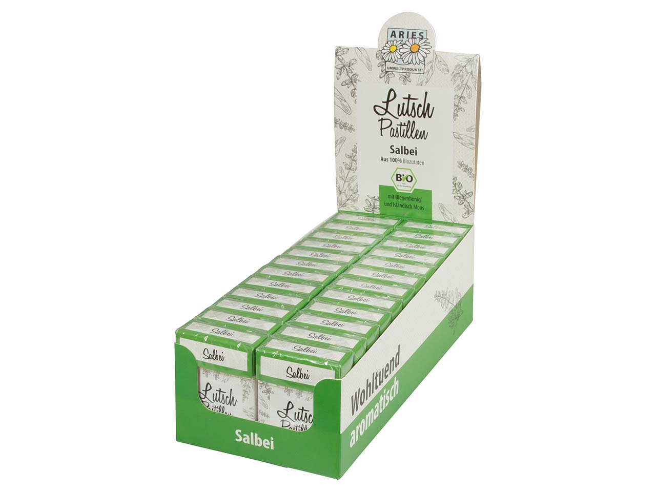 Die ARIES Lutschpastillen erhalten ihre wohltuende Kraft aus dem ätherischen Öl des Salbeistrauchs. In Kombination mit Isländisch Moos und der Unterstützung durch natürlichen Bienenhonig entstehen fruchtige, aromatische Pastillen, die wohltuend für Hals und Rachen wirken. Isländisch Moos enthält Stoffe, die sich wie ein Schutzfilm auf die Schleimhäute legen und so Halsbeschwerden und Heiserkeit lindern. Inhalt 30 g. DE-ÖKO-006.