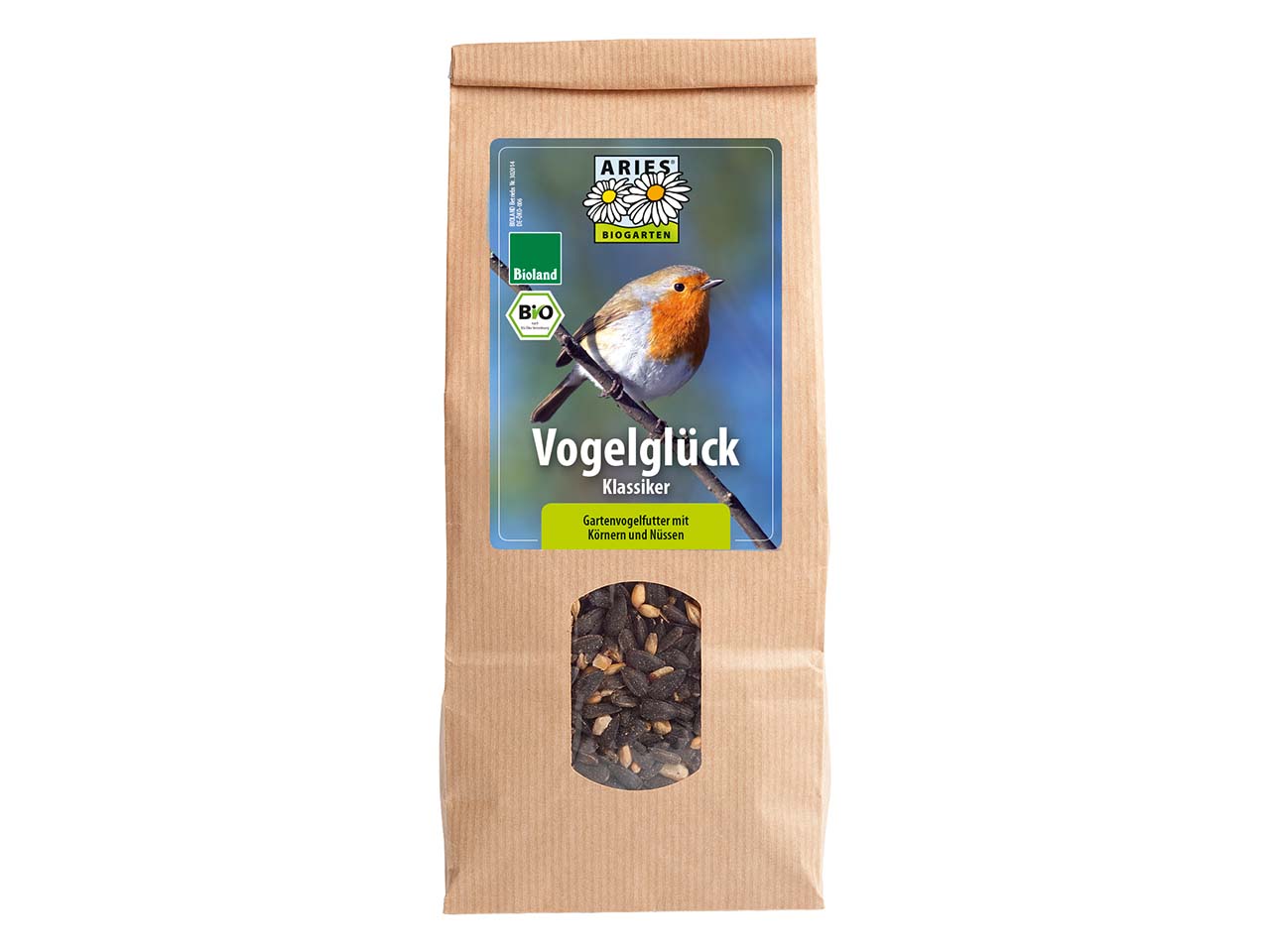 Ob mit oder ohne Bird Box, das Bio-Vogelfutter "Vogelglück" versorgt Gartenvögel mit allem, was sie brauchen. Die Zufütterung wird befürwortet, da es Vögel inzwischen sehr schwer haben, ganzjährig ausreichend Nahrung zu finden. Der Hauptgrund dafür findet sich beim Menschen: Lebensraumverschlechterungen und -verluste haben zu einem Abbau, in einigen Fällen zu einem Verlust, von vielen Vogelarten geführt. Das Vogelfutter mit Sonnenblumenkernen und Nüssen aus Bioland-Anbau bietet den Vögeln eine Hilfeleistung und ergänzt ihre eigenständige Nahrungssuche.