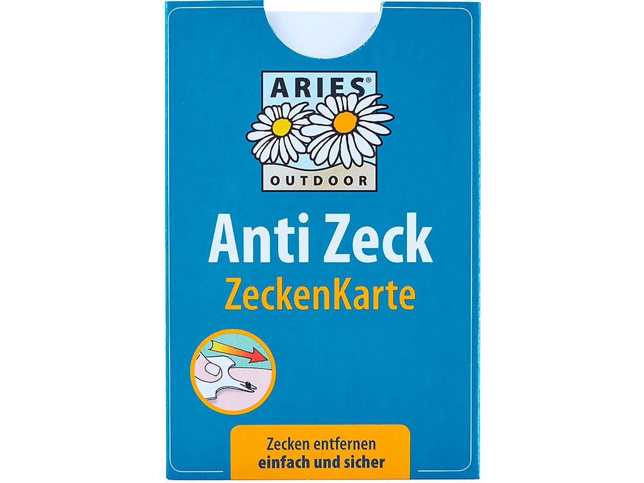 | Anwendung: | Die Einkerbung der Karte unter die Zecke schieben, die Karte vorne leicht anheben und weiterschieben – so wird die Zecke aus der Haut entfernt. Mit der kleineren Einkerbung auf der Zeckenkarte können Sie auch Stachel oder kleine, noch nicht vollgesogene Zecken entfernen. |