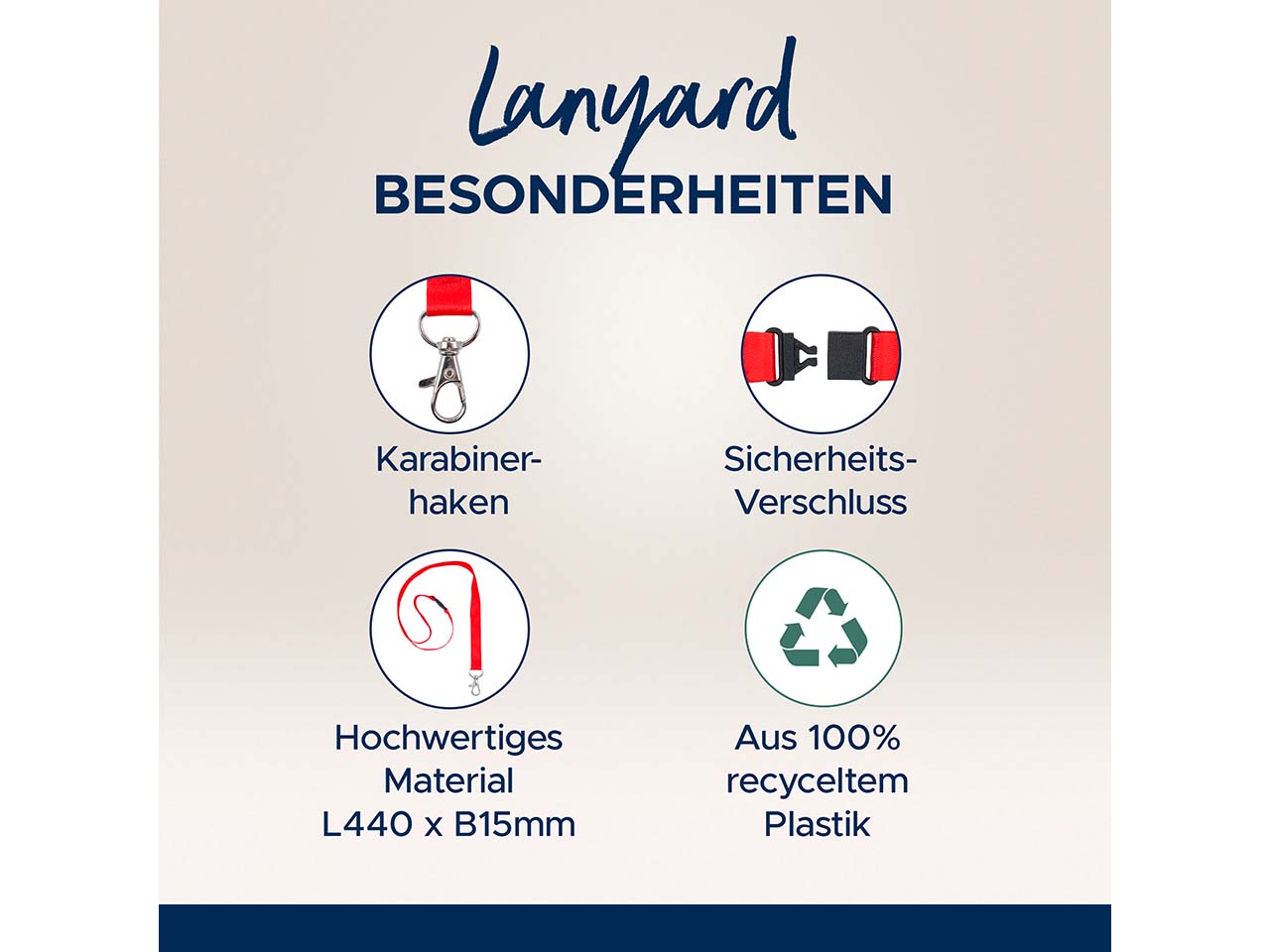 Praktische Lanyards mit Karabiner aus 100 % Recyclingkunststoff – perfekt für Seminare, Messen oder private Events! Die Umhängebänder sind ideal zum Tragen von Ausweisen, Schlüsseln oder anderen kleinen Gegenständen. Der stabile Karabinerverschluss sorgt dafür, dass die Anhänger sicher befestigt bleiben. Durch die Herstellung aus Recycling-PET sind die Lanyards umweltverträglicher als viele herkömmliche Produkte.