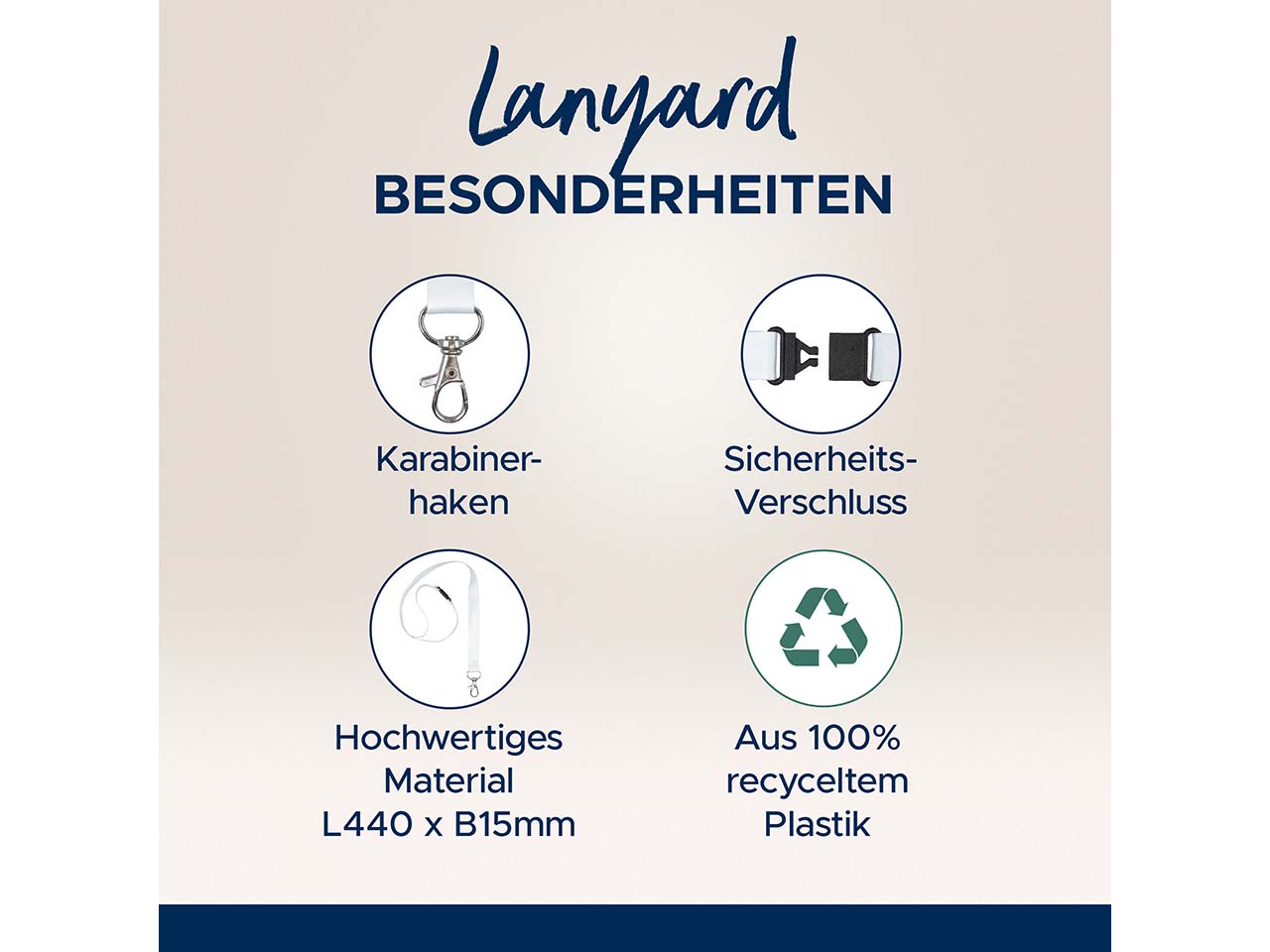 Praktische Lanyards mit Karabiner aus 100 % Recyclingkunststoff – perfekt für Seminare, Messen oder private Events! Die Umhängebänder sind ideal zum Tragen von Ausweisen, Schlüsseln oder anderen kleinen Gegenständen. Der stabile Karabinerverschluss sorgt dafür, dass die Anhänger sicher befestigt bleiben. Durch die Herstellung aus Recycling-PET sind die Lanyards umweltverträglicher als viele herkömmliche Produkte.