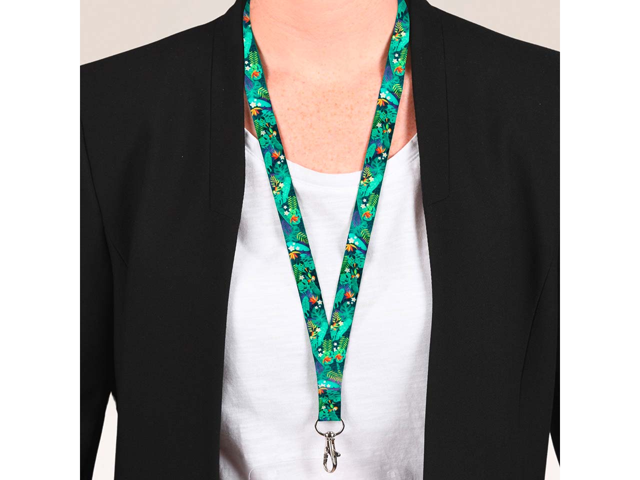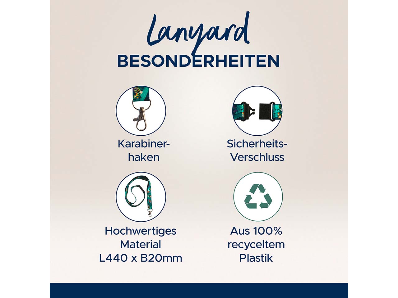 Ein praktisches Accessoire für den Alltag auf Seminaren, Messen oder privaten Events: Die farbenfrohen Lanyards in floralem Design bestehen zu 100 % aus Recyclingkunststoff. Die Umhängebänder verfügen über eine angenehme Breite und haben einen Karabiner sowie einen Sicherheitsverschluss. Dank robuster, langlebiger Qualität bieten sie selbst bei häufigem Gebrauch eine zuverlässige Funktionalität. Durch die Herstellung aus Recycling-PET sind die Lanyards umweltverträglicher als viele herkömmliche Produkte.