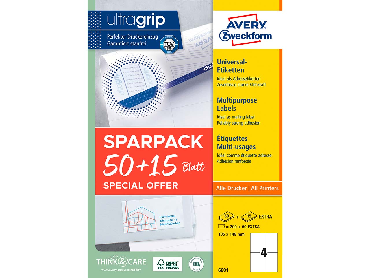 Avery Zweckform 260 Universaletiketten "6601" 50+15 Blatt, 105 x 148 mm