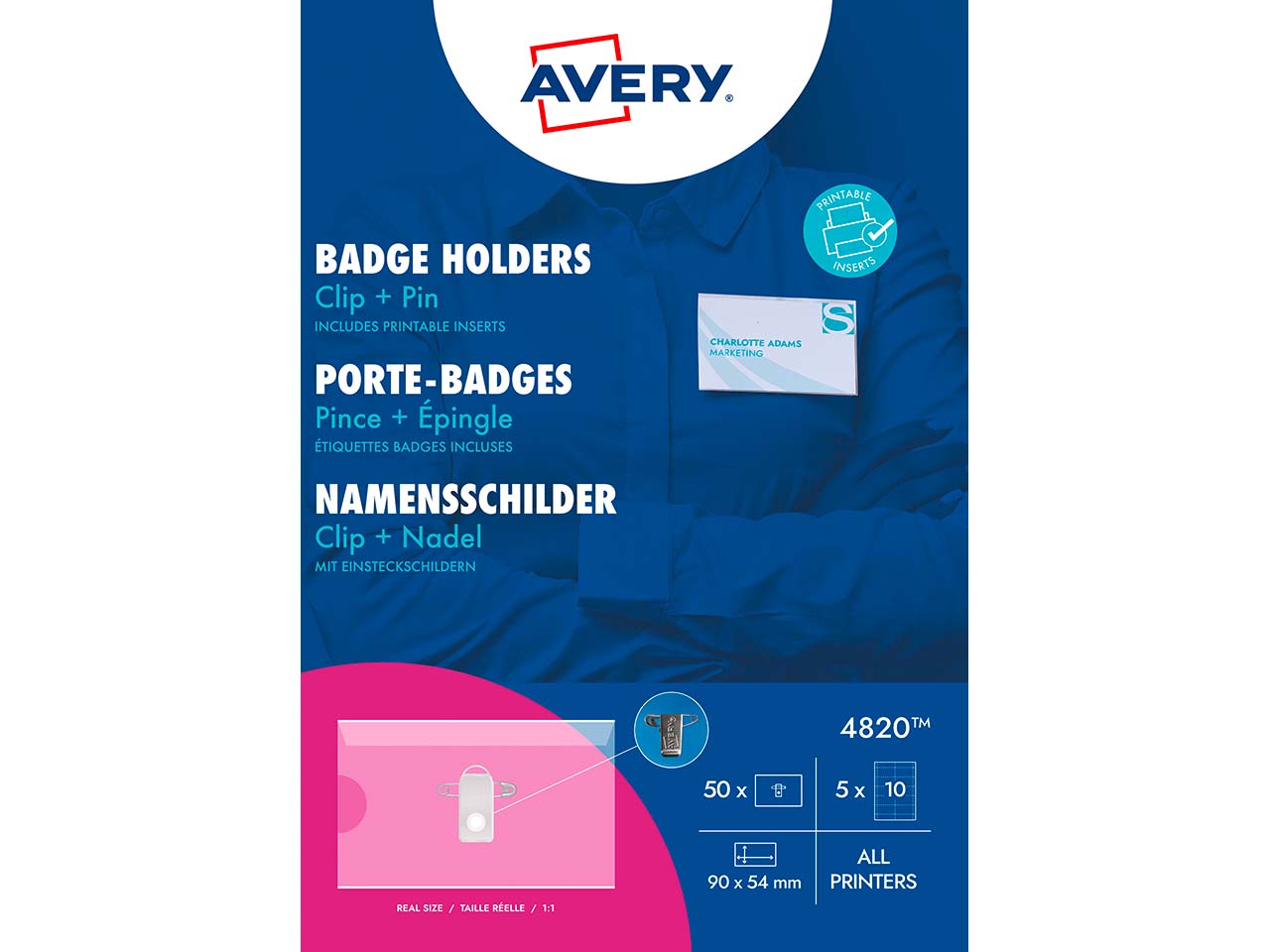 Avery Zweckform 50 Namensschilder mit Hülle, Clip+Pin, 90 x 54 mm