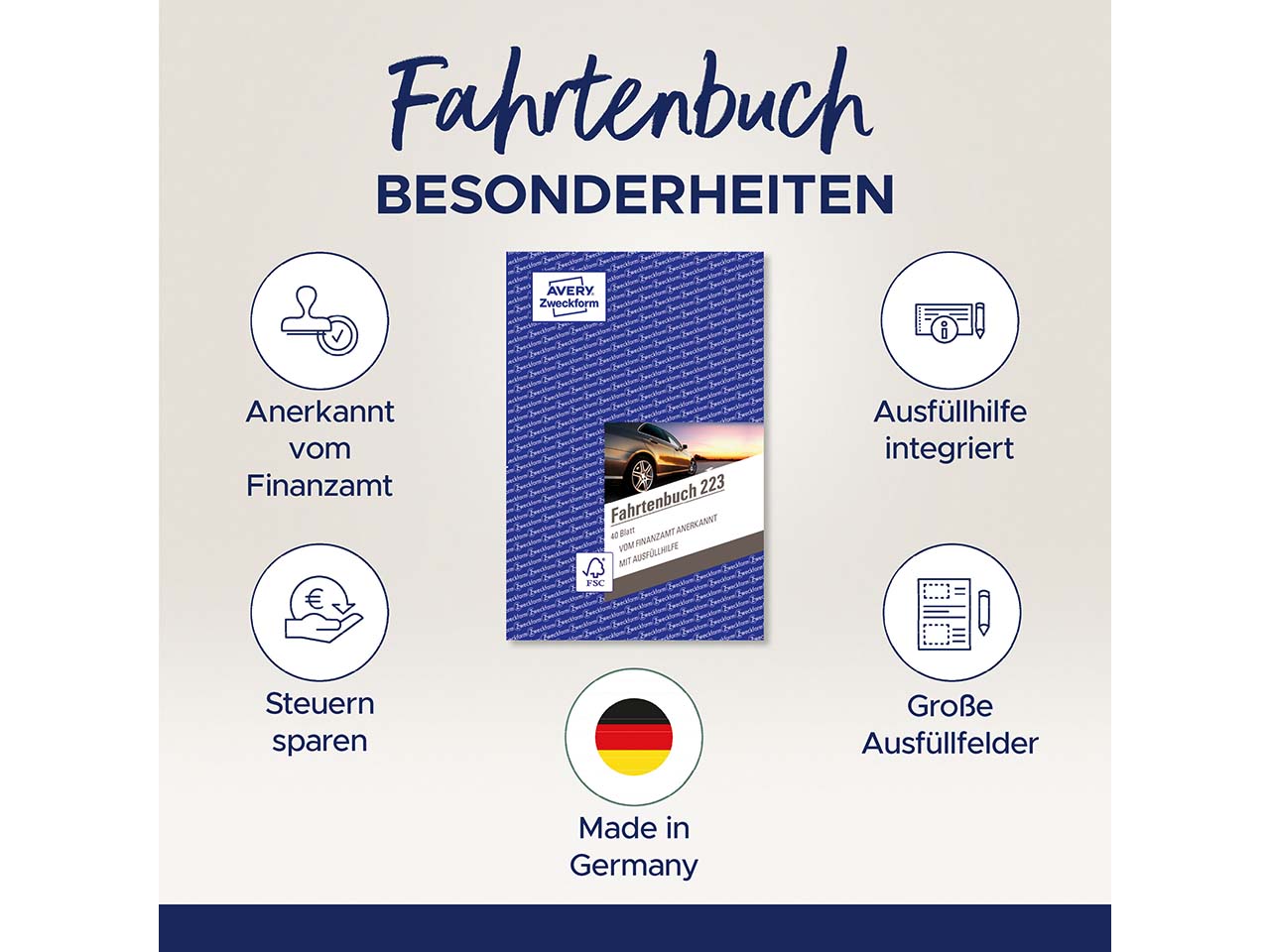 Mit dem Avery Zweckform Fahrtenbuch "223" lassen sich private und geschäftliche Fahrten ganz übersichtlich trennen. Mit dem Fahrtenbuch ist es möglich, Steuern zu sparen. Das FSC-zertifizierte Formularbuch hat große Ausfüllfelder, eine Ausfüllhilfe, eine Gesamtübersicht und eine Jahresabrechnung. Das regelmäßig von Rechtsexperten geprüfte Fahrtenbuch passt perfekt ins Handschuhfach und wird vom Finanzamt als steuerlicher km-Nachweis anerkannt. Nutzbar für Deutschland und Österreich.
