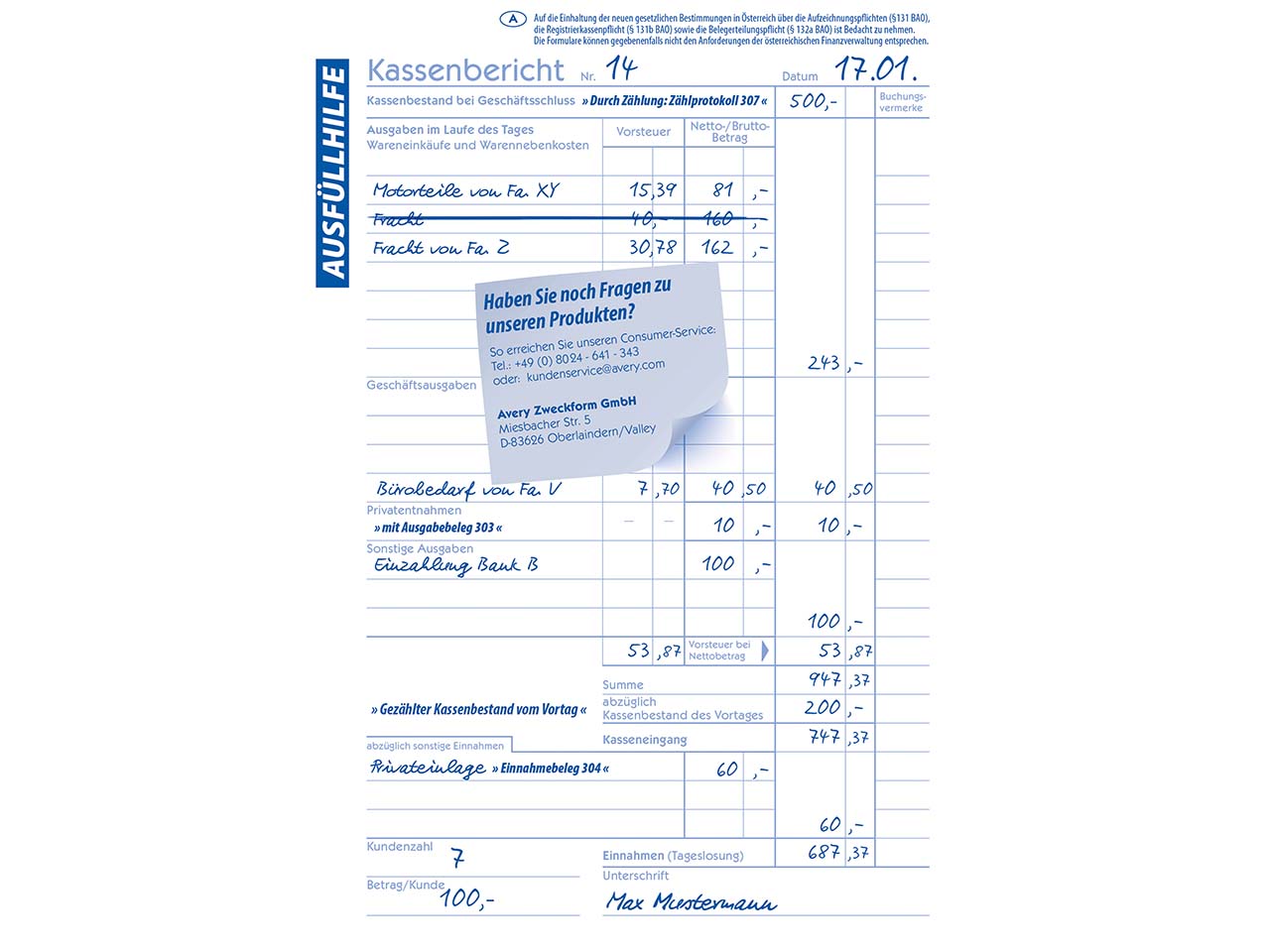 Mit dem Avery Zweckform Formularbuch "Kassenbericht" lassen sich steuerpflichtige Einnahmen eines Tages fest. Es lassen sich verschiedene Anwendungen wie Wareneinkäufe und Geschäftsausgaben separat auflisten. Das Formularbuch mit Sicherheitsbindung verfügt über eine praktische Abheft-Lochung. 1-facher Durchschlag. Der Kassenbericht ist für Deutschland und Österreich geeignet.