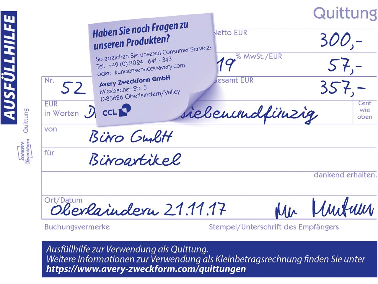 Mit dem Avery Zweckform Recycling Formularbuch "Quittung" wickeln Sie Dienstleistungen und Verkäufe schnell und einfach ab. Mit vielen Besonderheiten, wie Fälschungssicherheit durch den netzartigen Dokumentendruck. 1-facher Durchschlag. Grammatur 60 g/m². Format DIN A6 quer. 1 Block = 100 Blatt.