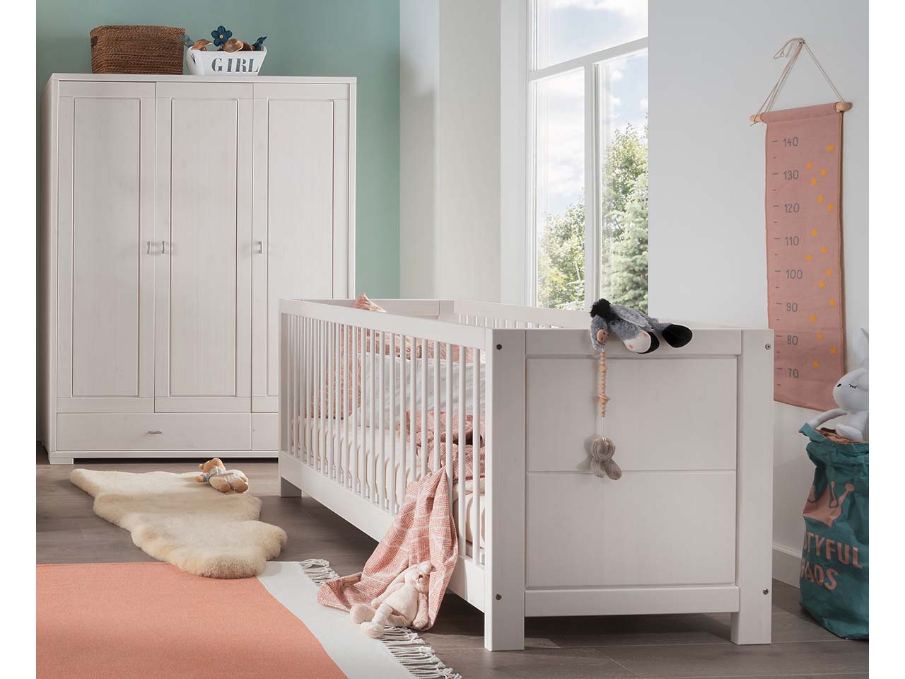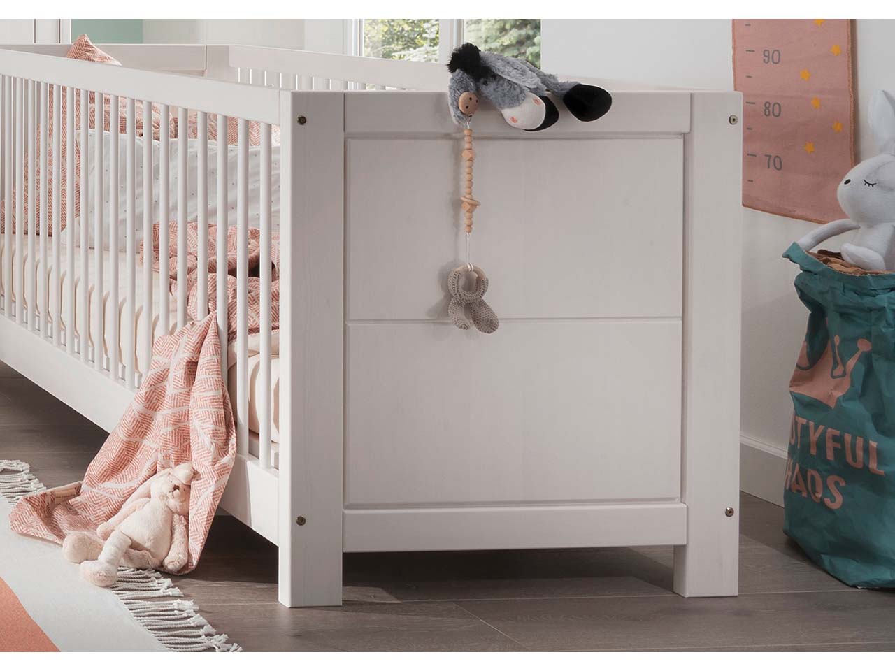 In diesem wunderschönen Holzbett können sich Babys rundum wohlfühlen! Der minimalistische Stil fügt sich in jedes Kinder- oder Schlafzimmer ein und vermittelt Ruhe und Harmonie. Exzellente Verarbeitung und stabile Qualität zeichnen das Babybett aus FSC-zertifiziertem, massivem Kiefernholz aus. Die 3 Schlupfsprossen tragen zur Sicherheit bei und lassen sich leicht entfernen. Der Matratzenrahmen ist außerdem in der Höhe verstellbar. Erhältlich in Weiß, Weiß/Provence oder in gebeizter, geölter Qualität. B 76 x T 146 x H 79 cm.